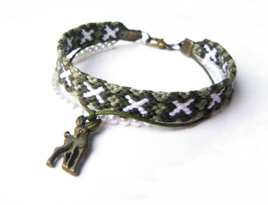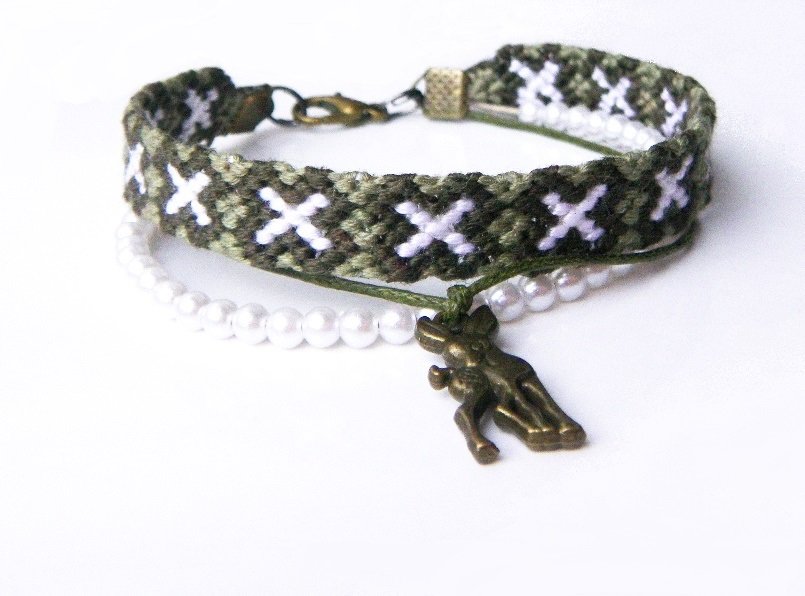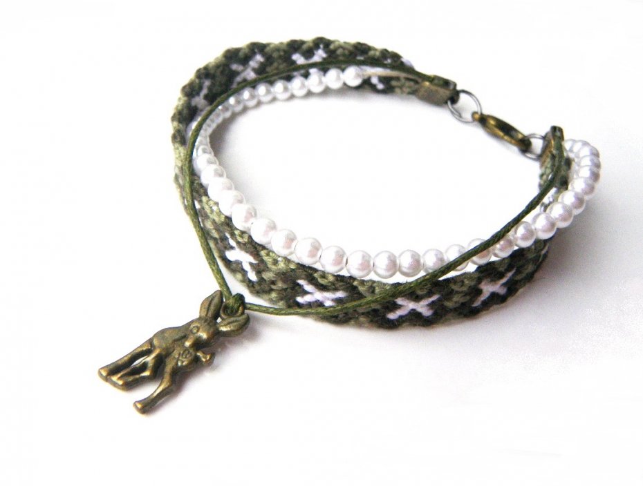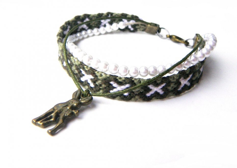 Delikatna bransoleta, złożona z 3 elementów: ręcznie pleciona bransoletka, sznurek bawełniany z plastikowymi perełkami, woskowany sznurek bawełniany z dwustronną zawieszką metalową - sarenka.