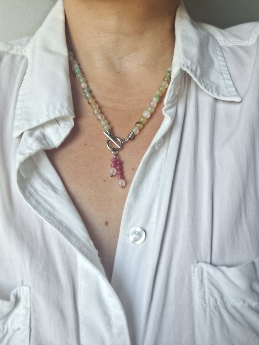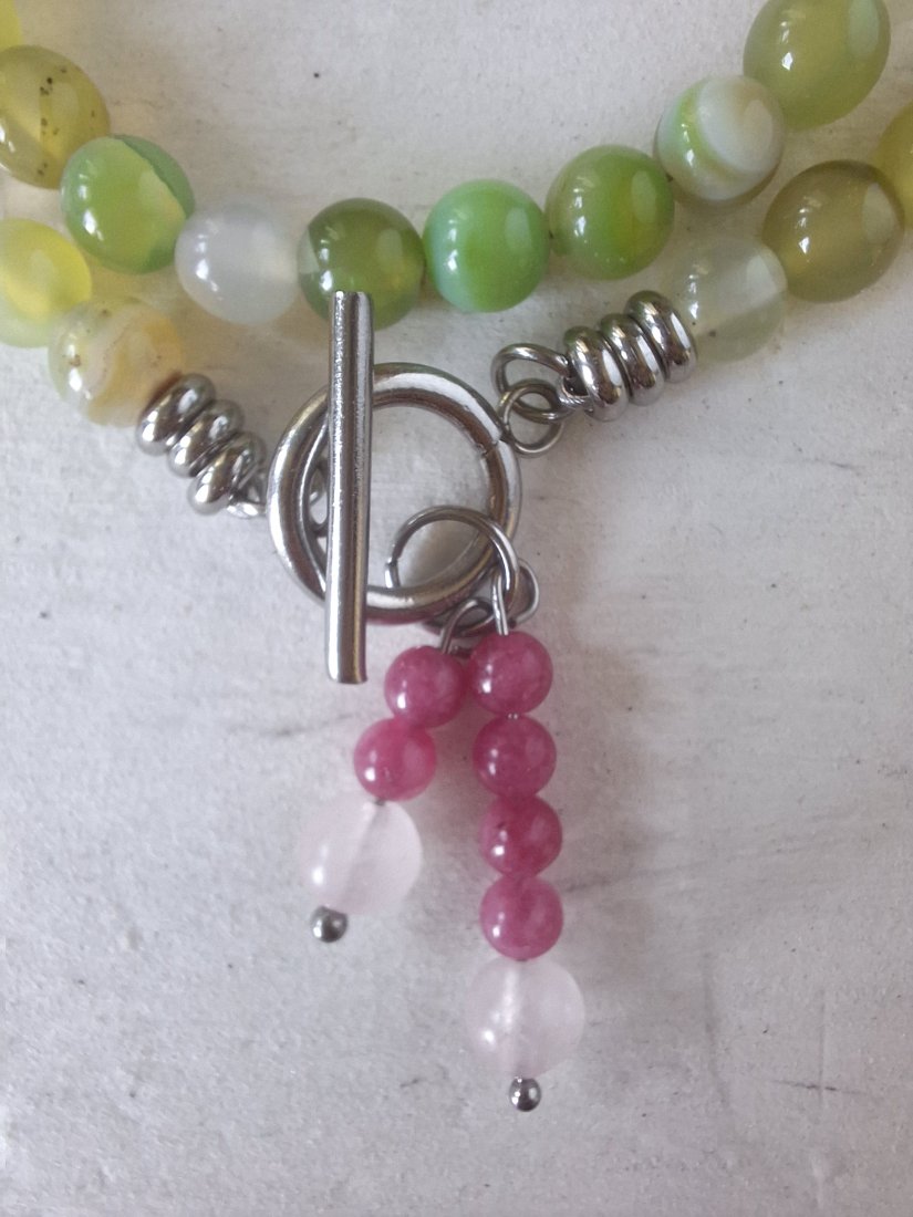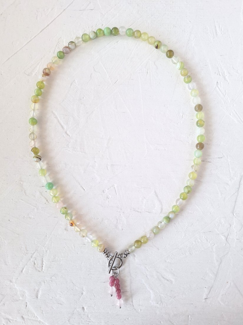 Choker z agatu 6 mm, zapięcie toggle z zawieszką z rodonitu i kwarcu różowego.