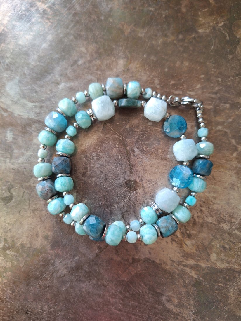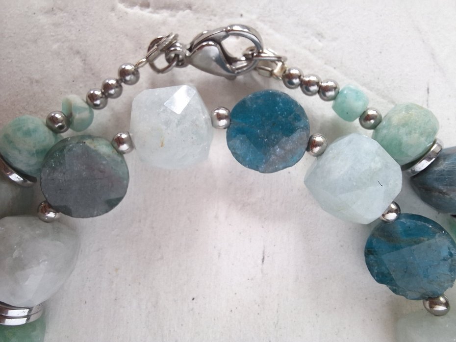 Amazonit, apatyt i akwamaryn fasetowane, przekładane hematytem i stalą chirurgiczną.