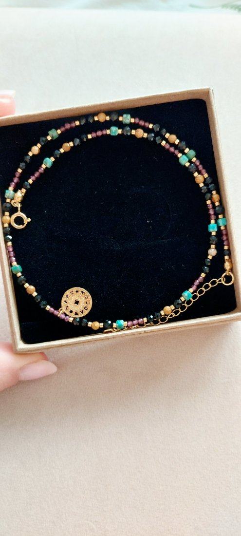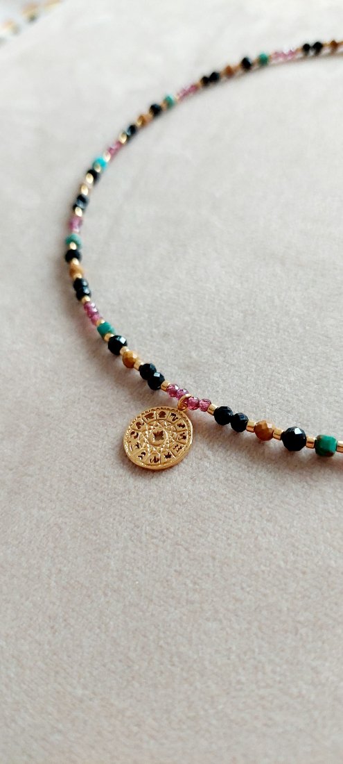 Naszyjnik w Zodiakalnym klimacie stworzony z kamieni naturalnych, koralików Toho i srebra pozłacanego 24-karatowym złotem. Zawieszka w formie koła zodiakalnego ma średnicę około 10 mm. Kamienie użyte w naszyjniku to: