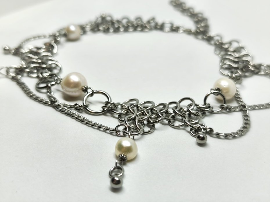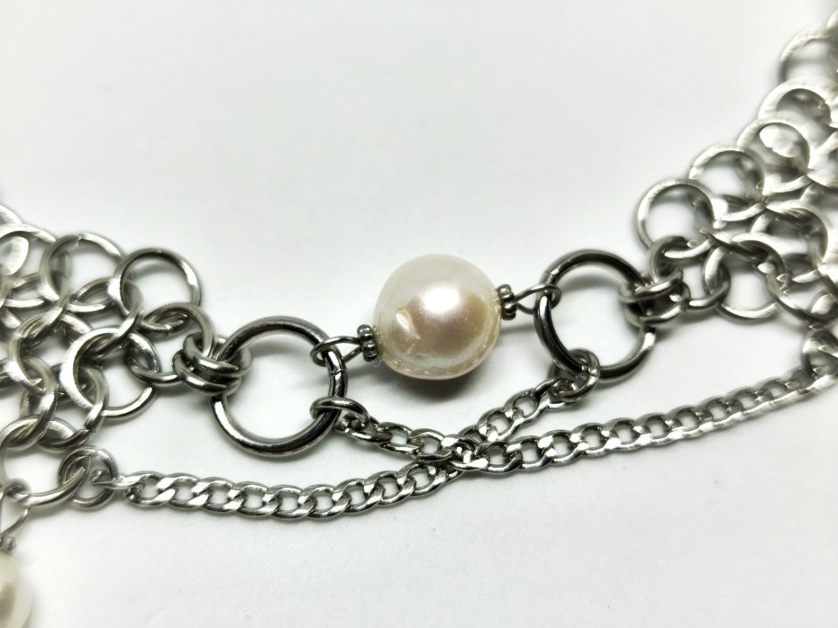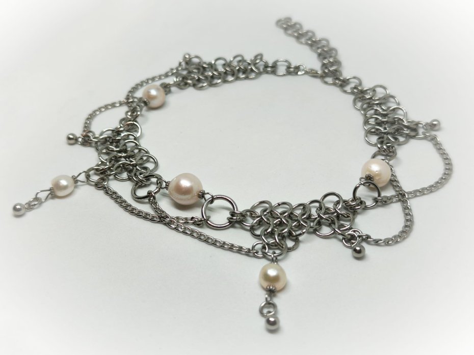 Ręcznie tkany centralny element z ogniwek stali chirurgicznej 316L, w które wkomponowane jest 5 prawdziwych pereł słodkowodnych – w tym 3 ogromne barokowe perły 10–12 mm, które pięknie odbijają światło.