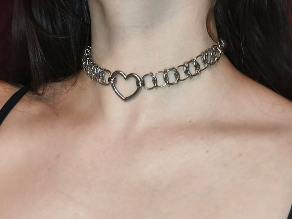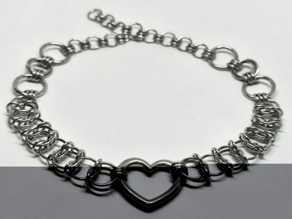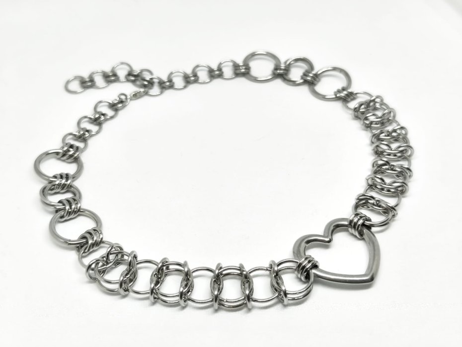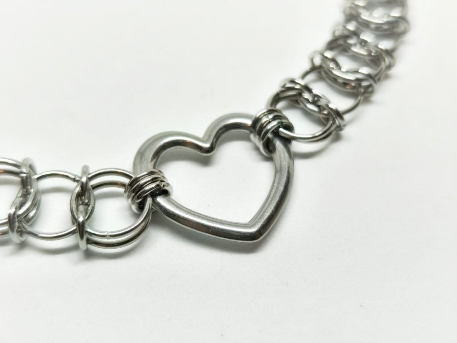 ♡ "Steel Sweetheart" – choker z sercem ze stali, które nigdy nie pęknie. Całość ręcznie tkana z tysięcy ogniwek stali chirurgicznej 316L – ten sam materiał, co implanty medyczne. Zero alergii, zero czernienia, możesz w nim spać, pływać, tańczyć na festiwalu.