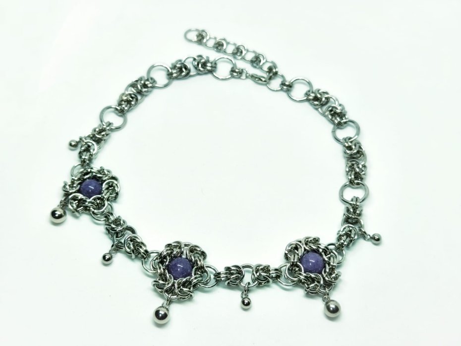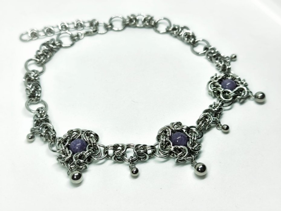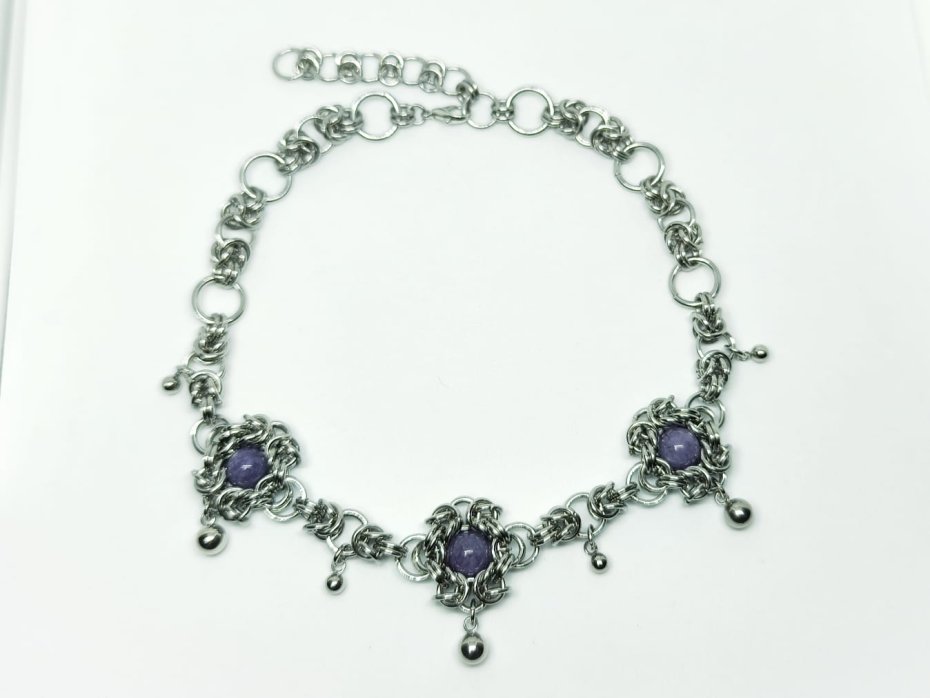 Elegancki choker ręcznie pleciony techniką chainmaille ze stali chirurgicznej 316L – trzy koraliki naturalnego fioletowego chalcedonu, błyszczące kuleczki stalowe.