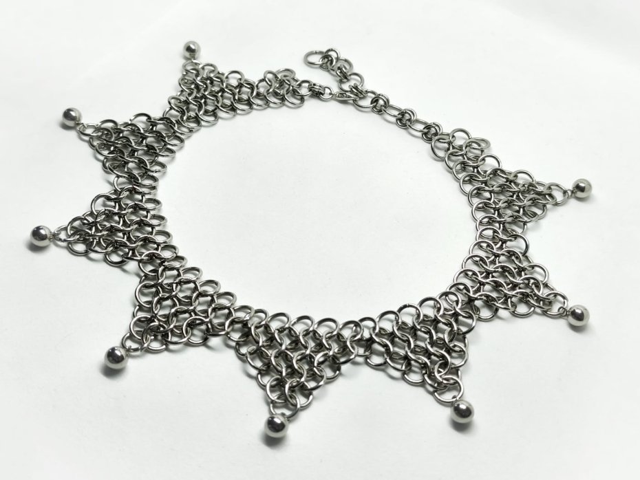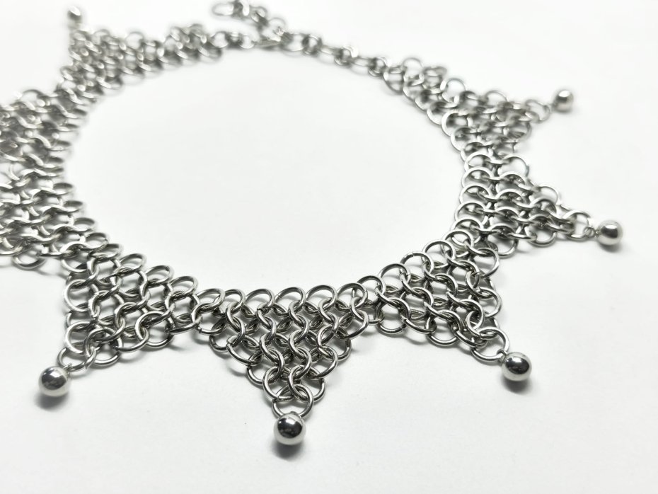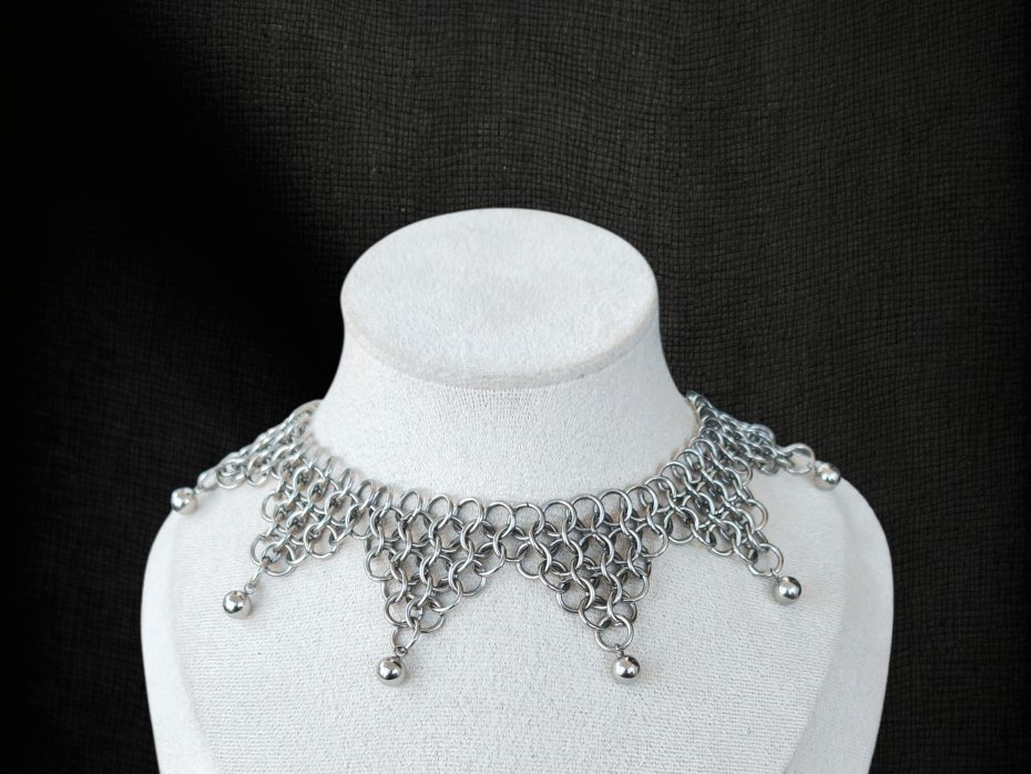 Surowy, ciężki choker chainmaille – gęsty, wielowarstwowy splot z ogniwek ze stali chirurgicznej 316L, błyszczące kuleczki ze stali nierdzewnej dodają metalicznego blasku i subtelnego ruchu. Zero delikatności, czysta stalowa moc, industrialny chłód i ten charakterystyczny ciężar na szyi – wygląda jak fragment kolczugi albo mroczny talizman.