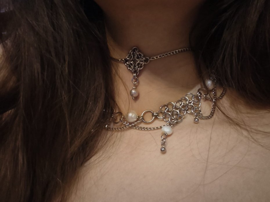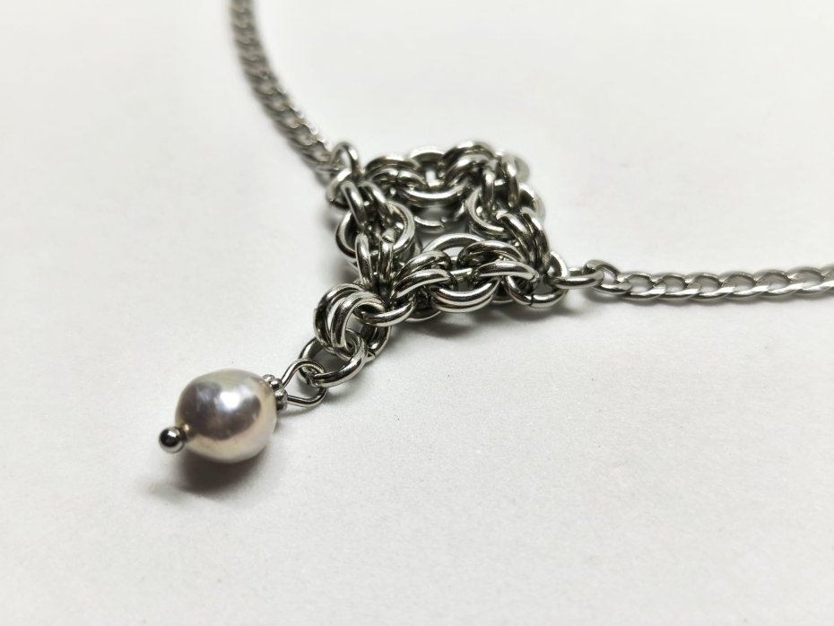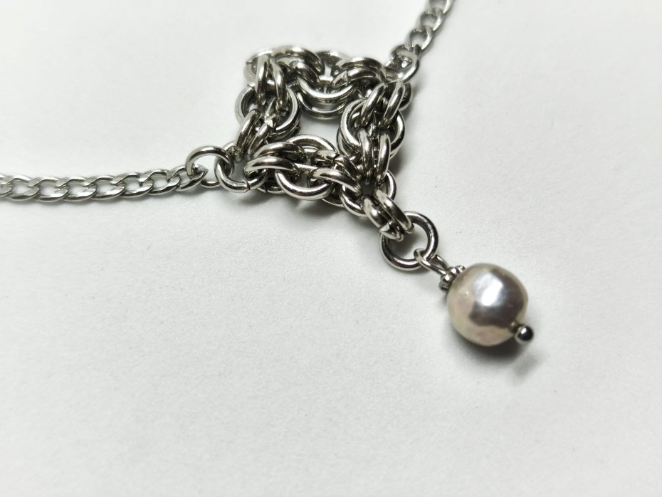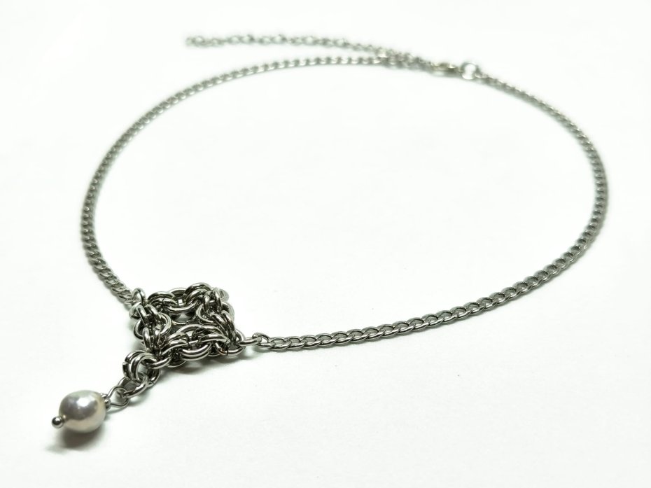 Choker dla współczesnych wiedźm. Delikatny chainmaille z ogniwek stali chirurgicznej 316L otacza jedną, absolutnie hipnotyzującą perłę słodkowodną.