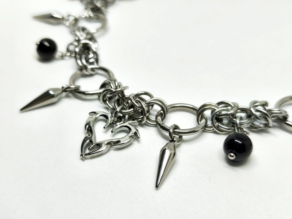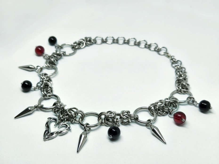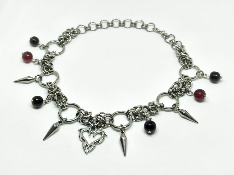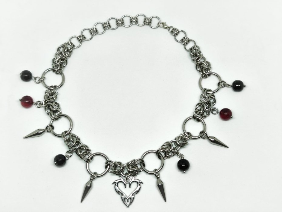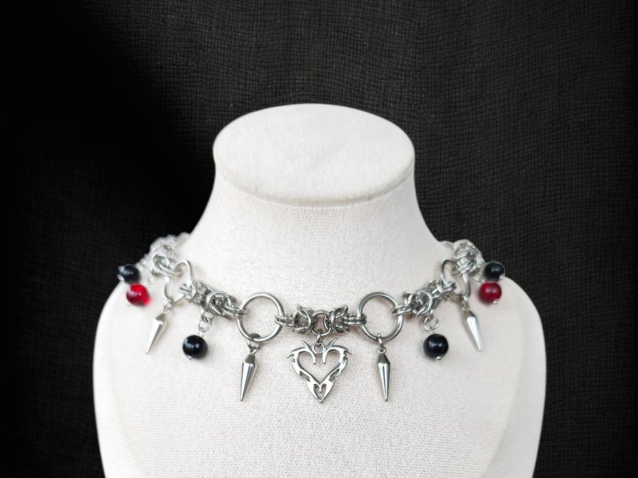 Mroczny, ciężki choker chainmaille w krwistoczerwono-czarnym wydaniu – centralne serce ze stali nierdzewnej, ostre kolce wokół i wiszące szklane koraliki w głębokiej czerni oraz wiśniowej czerwieni. Całość pleciona z ogniwek ze stali chirurgicznej 316L – zero delikatności, sama stalowa moc i kontrastujący blask.