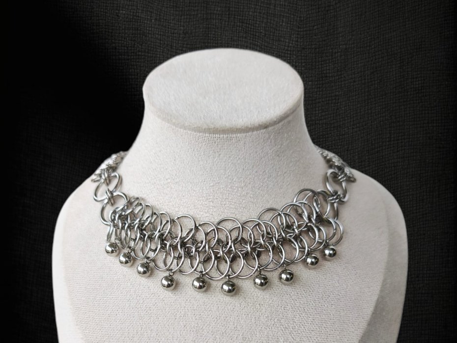 Przepiękny, dynamiczny choker z gęstej plecionki chainmaille i wiszącymi stalowymi kulkami – przy każdym ruchu delikatnie dzwoni i mieni się w świetle. Wygląda jak średniowieczna kolczuga z nutą gothic/punk – mega efektowny, ale bardzo wygodny - można w nim spać i kąpać się w basenie.