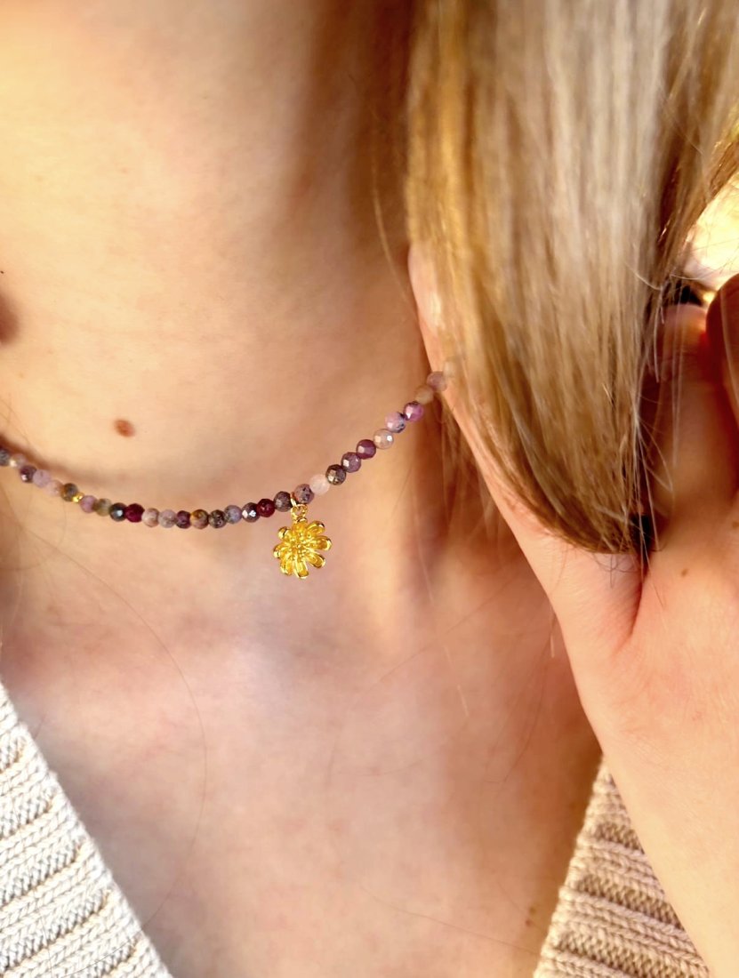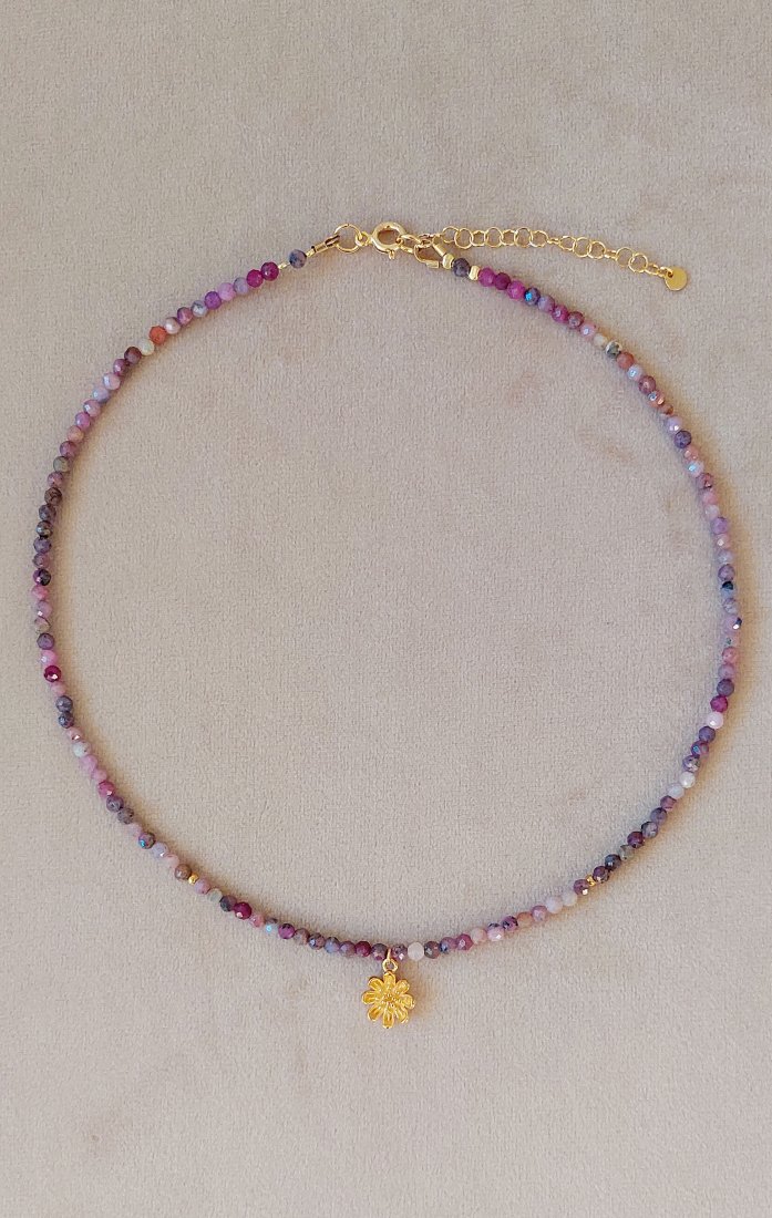 Naszyjnik typu choker wykonany z kamieni rubin z szafirem. Zawieszka w kształcie uroczej stokrotki oraz zapięcie wykonane zostały ze srebra pozłacanego 24-karatowym złotem. Długość naszyjnika to 38 cm, które można wydłużyć o 5 cm dzięki praktycznej przedłużce. Wielkość kamieni 3 mm, zawieszki - ok 10 mm.