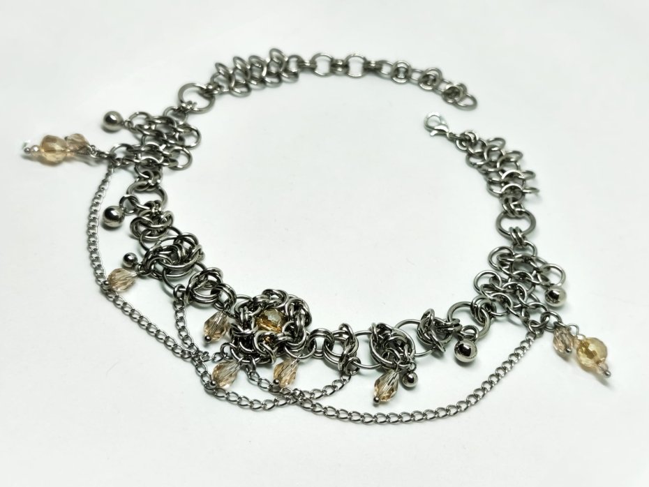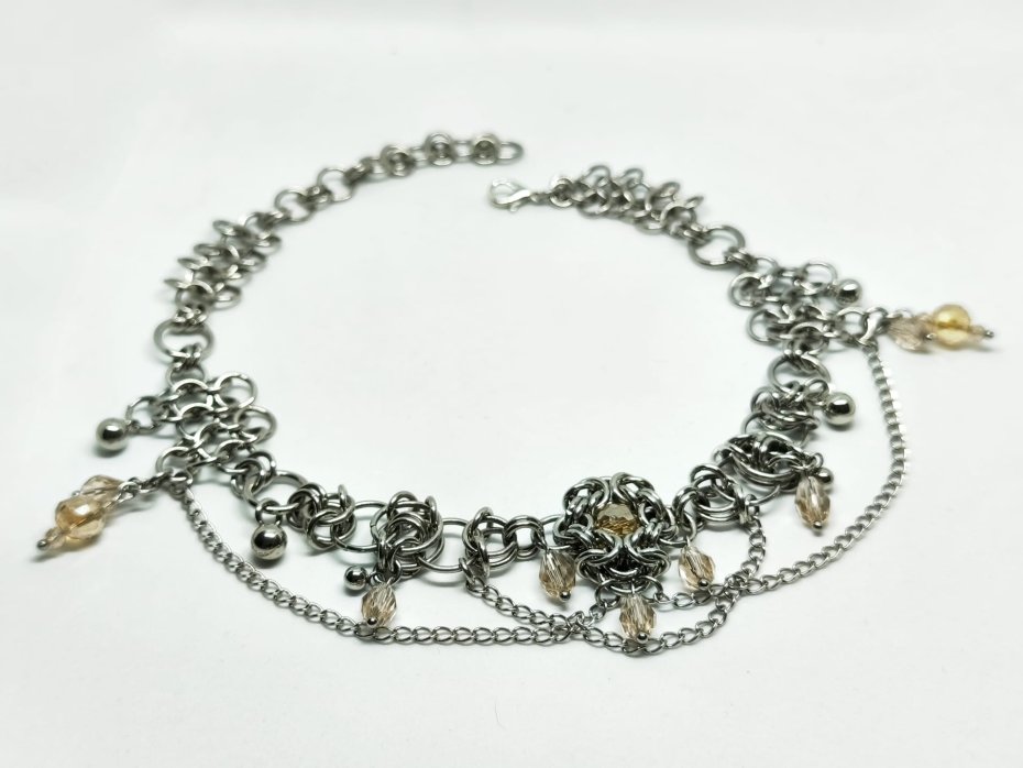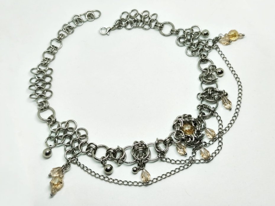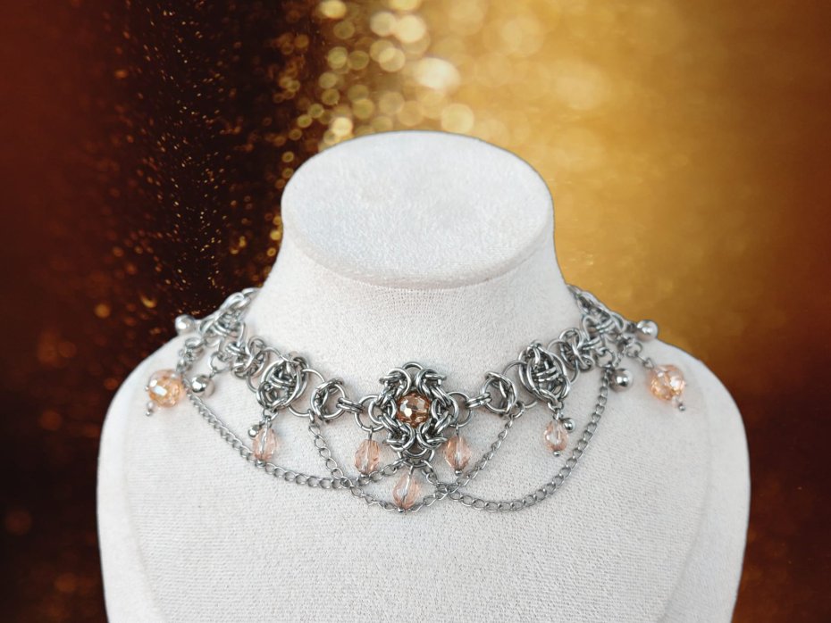 Magiczny, elficki choker chainmaille w złotym wydaniu – gęsty splot ze stali chirurgicznej 316L, centralny złocisty kryształ i mnóstwo wiszących fasetowanych koralików czeskiego szkła w ciepłym, złotym odcieniu. Do tego delikatne łańcuszki i błyszczące metalowe kuleczki – wszystko mieni się jak skarb leśnych wróżek albo promienie słońca w koronie drzew.