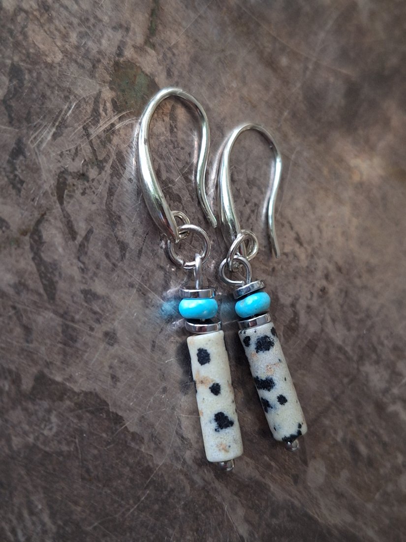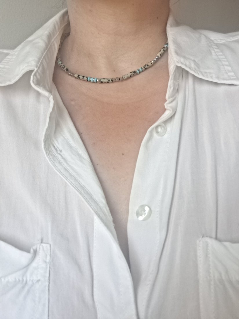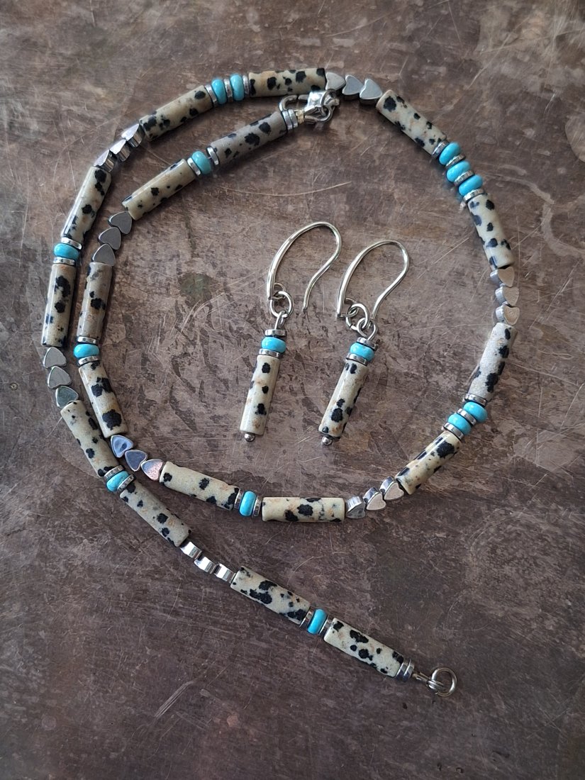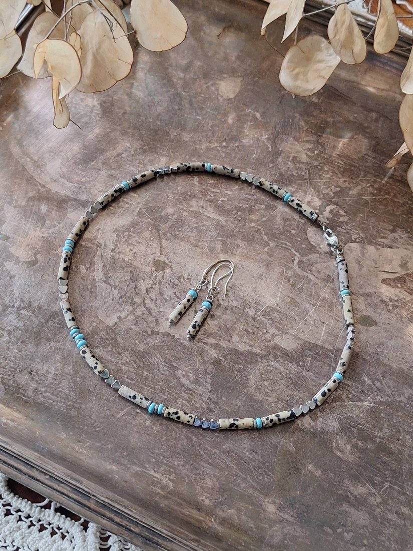 Choker i kolczyki z jaspisu dalmatyńskiego z howlitem przekładane hematytem w dwóch kształtach, w tym serduszka.