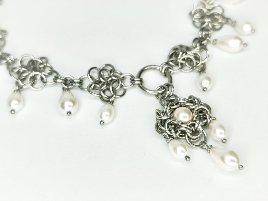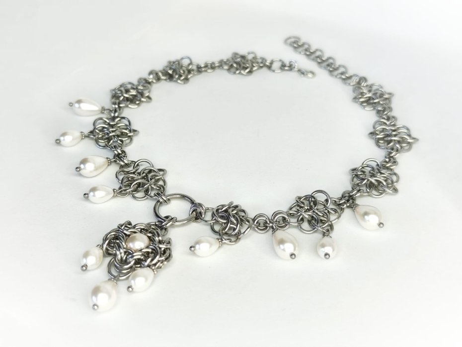 Mroczny, ale subtelnie perłowy choker chainmaille – gęsty, wielowarstwowy splot ze stali chirurgicznej 316L, wiszące łezki ze szkła malowanego farbą o głębokim, perłowym połysku. Całość wygląda jak biżuteria z mrocznego dworu, w którym królowa elfów lub wiedźma tańczy w księżycowym świetle – zimna stal kontrastuje z delikatnym, mleczno-perłowym blaskiem.