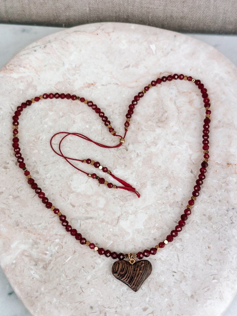 Naszyjnik W O O D E N H E A R T na jedwabnym sznurku. Drewniane serce z chalcedonem.
