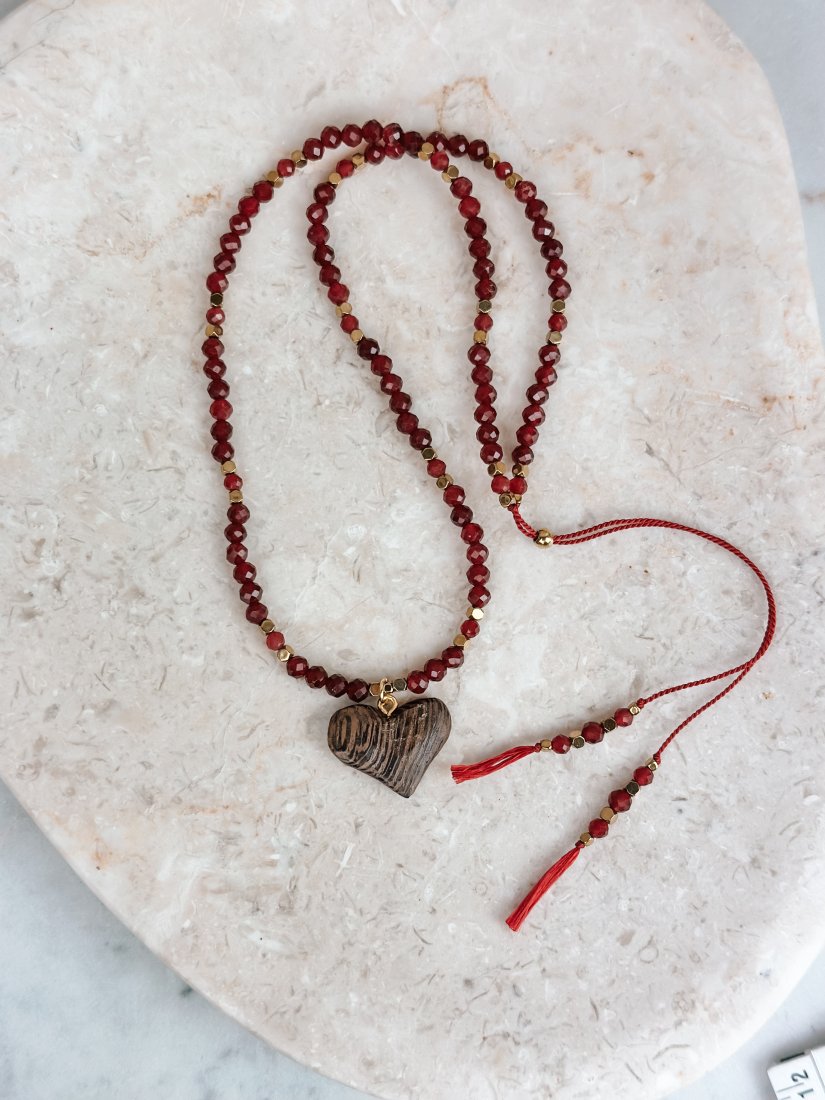 Naszyjnik W O O D E N H E A R T na jedwabnym sznurku. Drewniane serce z chalcedonem.