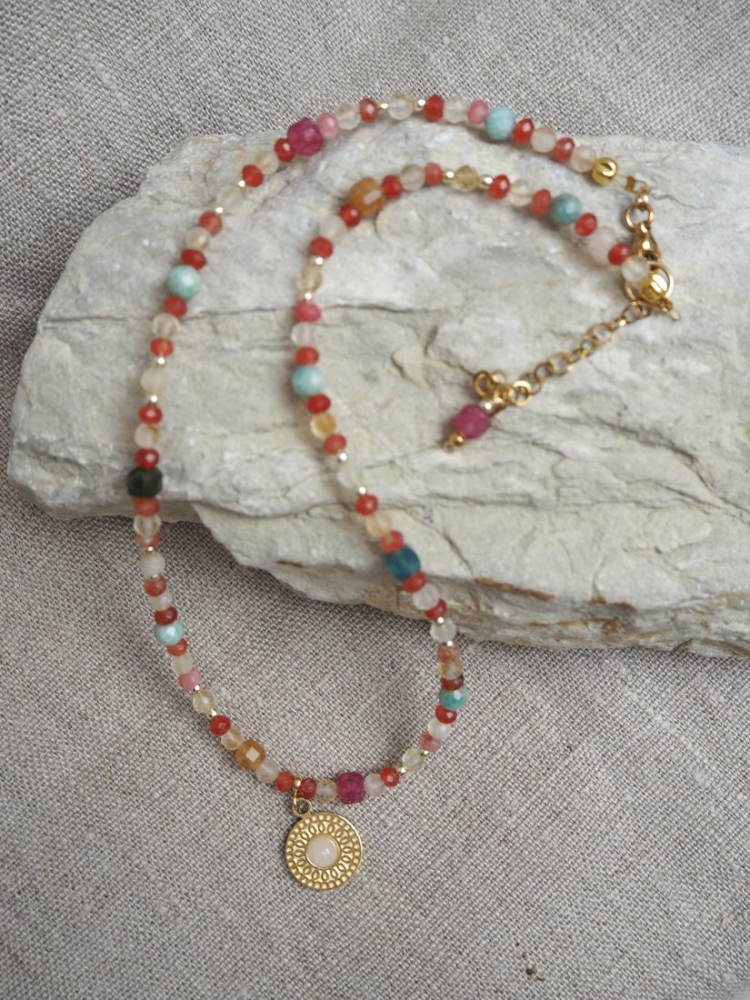 ♥ unikatowy wzór – niepowtarzalny układ kamieni i kolorów, landrynkowy look, naszyjnik ozdobiony jest zawieszka ze stali chirurgicznej - rogiem obfitości.