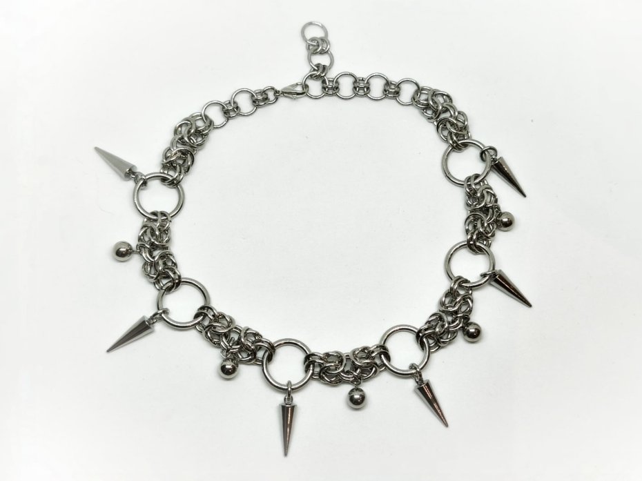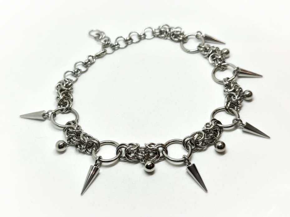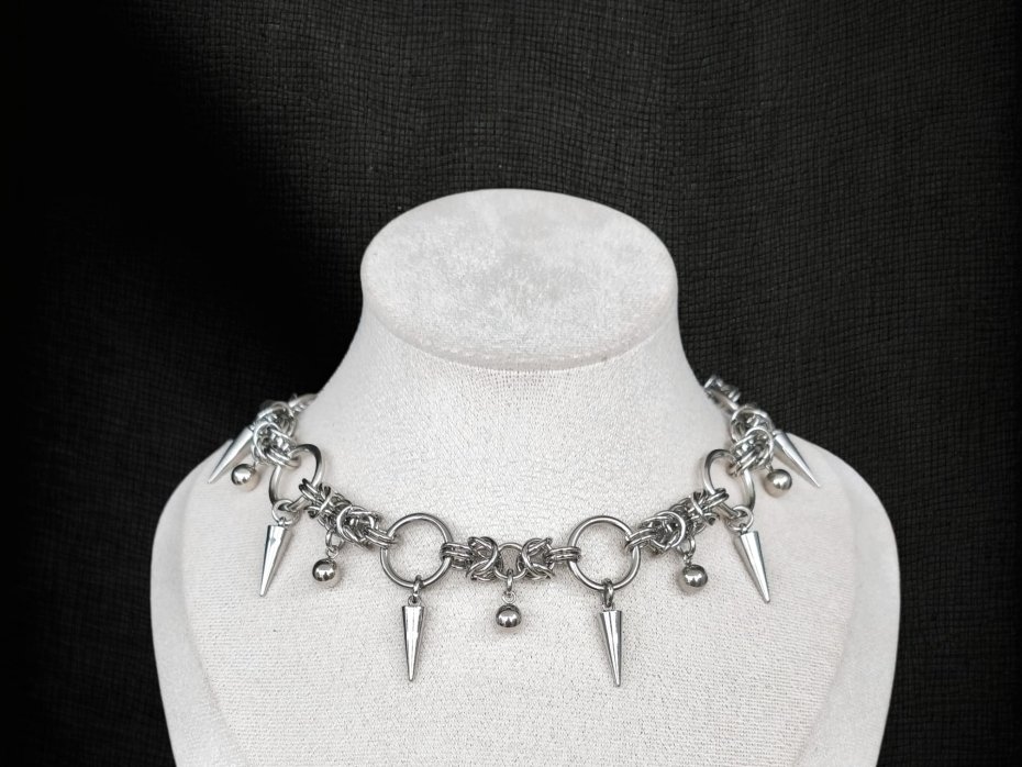 Mroczny, ciężki choker chainmaille pełen ostrych kolców i błyszczących koralików – czysty industrialny, punkowy i gothic vibe w jednym. Gęsty splot z ogniwek ze stali chirurgicznej 316L, wszędzie stal nierdzewna – kolce, kuleczki i ringi. Zero delikatności, sama stalowa moc i blask.