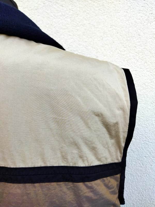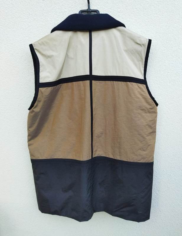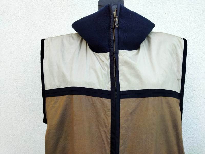 Lekko ocieplana kamizelka z bawełniano-poliestrowej tkaniny w dwóch odcieniach beżu ze złocistym połyskiem i czerni . Zapinana na zamek, z dzianinowym kołnierzem , z dwiema wpuszczanymi poziomymi kieszeniami zasuwanymi na zamki. Na pikowanej lekko ocieplanej podszewce.