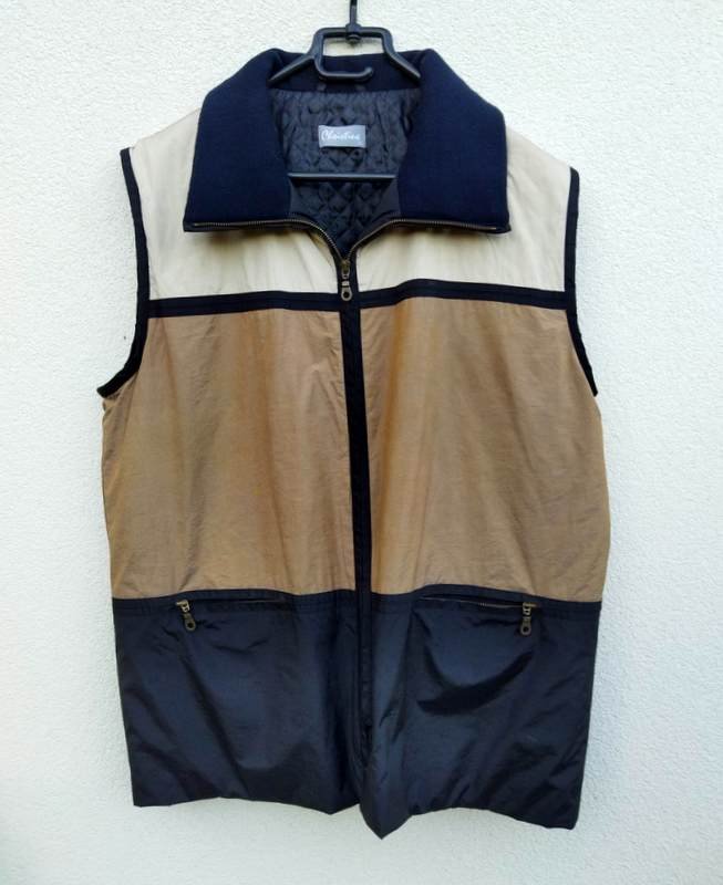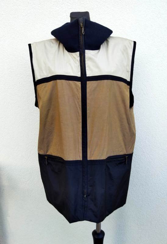 Lekko ocieplana kamizelka z bawełniano-poliestrowej tkaniny w dwóch odcieniach beżu ze złocistym połyskiem i czerni . Zapinana na zamek, z dzianinowym kołnierzem , z dwiema wpuszczanymi poziomymi kieszeniami zasuwanymi na zamki. Na pikowanej lekko ocieplanej podszewce.