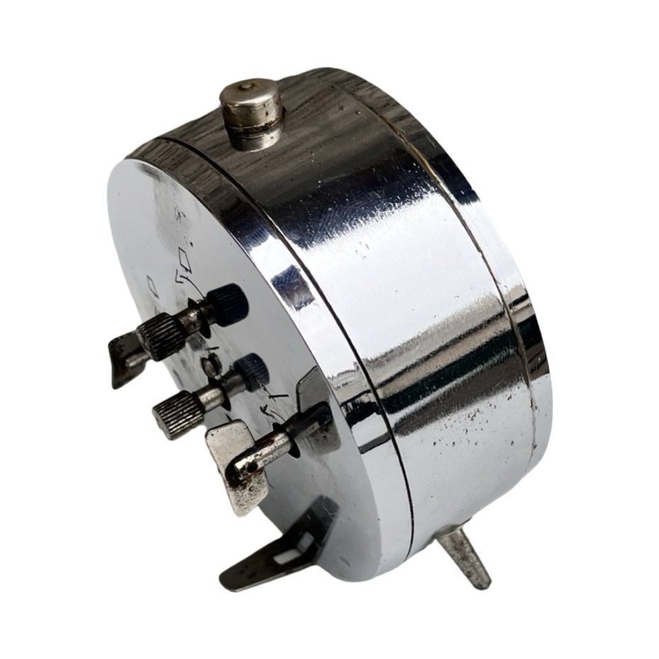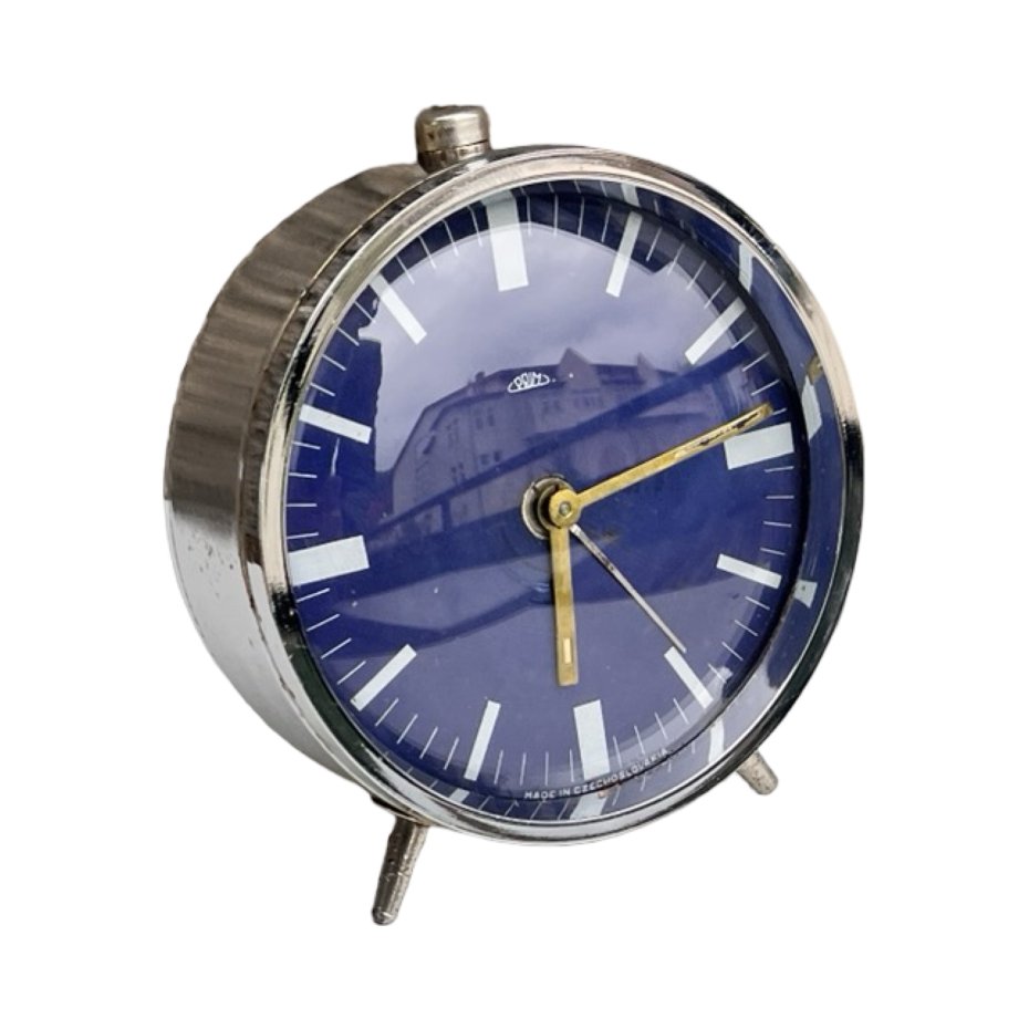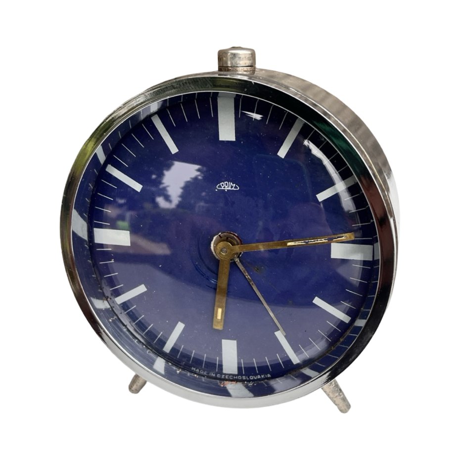 Klasyczny budzik mechaniczny PRIM wyprodukowany w Czechosłowacji w latach 70. Kultowy model z charakterystyczną, prostą formą i czytelną tarczą w stylu modernistycznym.
