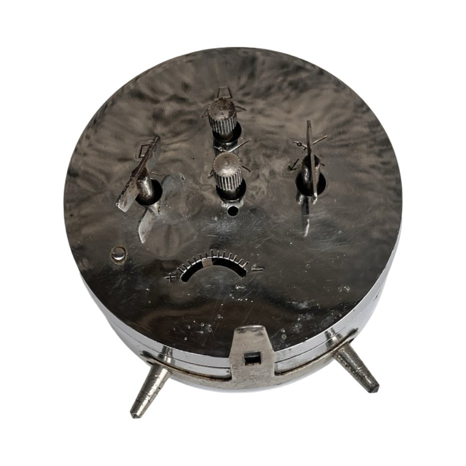 Korpus w kolorze ceglastoczerwonym, z metalowym pierścieniem i wypukłym szkłem. Zegar wyposażony w mechanizm nakręcany ręcznie, działający sprawnie i z wyraźnym dźwiękiem alarmu.