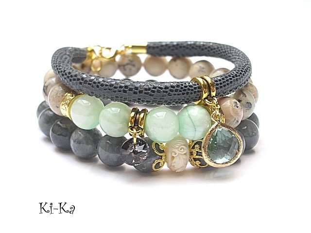 Komplet trzech bransoletek wykonany z naturalnych kamieni - opal afrykański [10mm], jadeity [10mm], oponki z korala rekonstruowanego ,zawieszki kryształka Swarovskiego efektownej zawieszki ze szkła w oprawie mosiężnej platerowanej złotem ,rzemienia z naturalnej skórki cielęcej [6mm] oraz elementów metalowych w kolorze złota. Bransoletki na gumce silikonowej. Pasują na nadgarstek 16-17cm. Biżuteria ozdobnie zapakowana