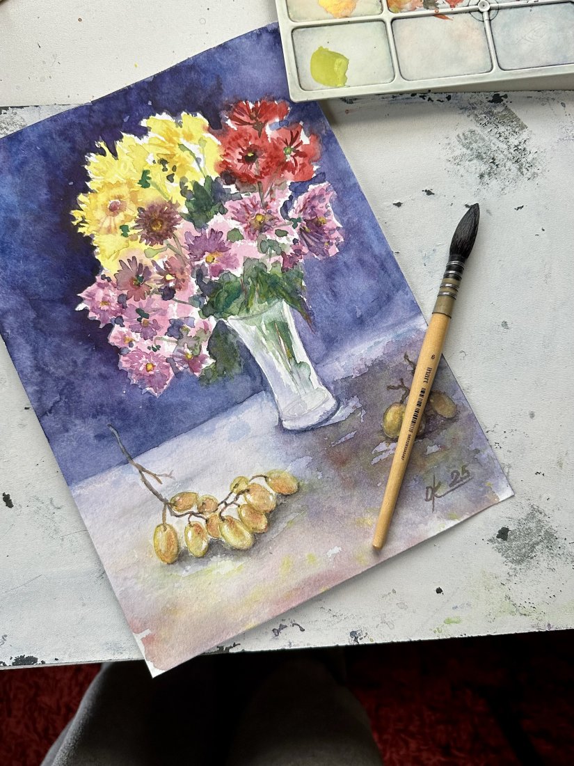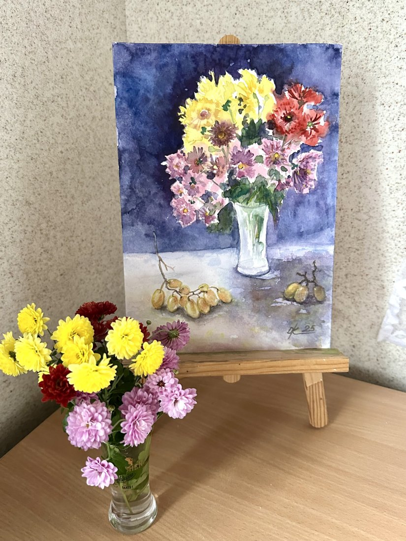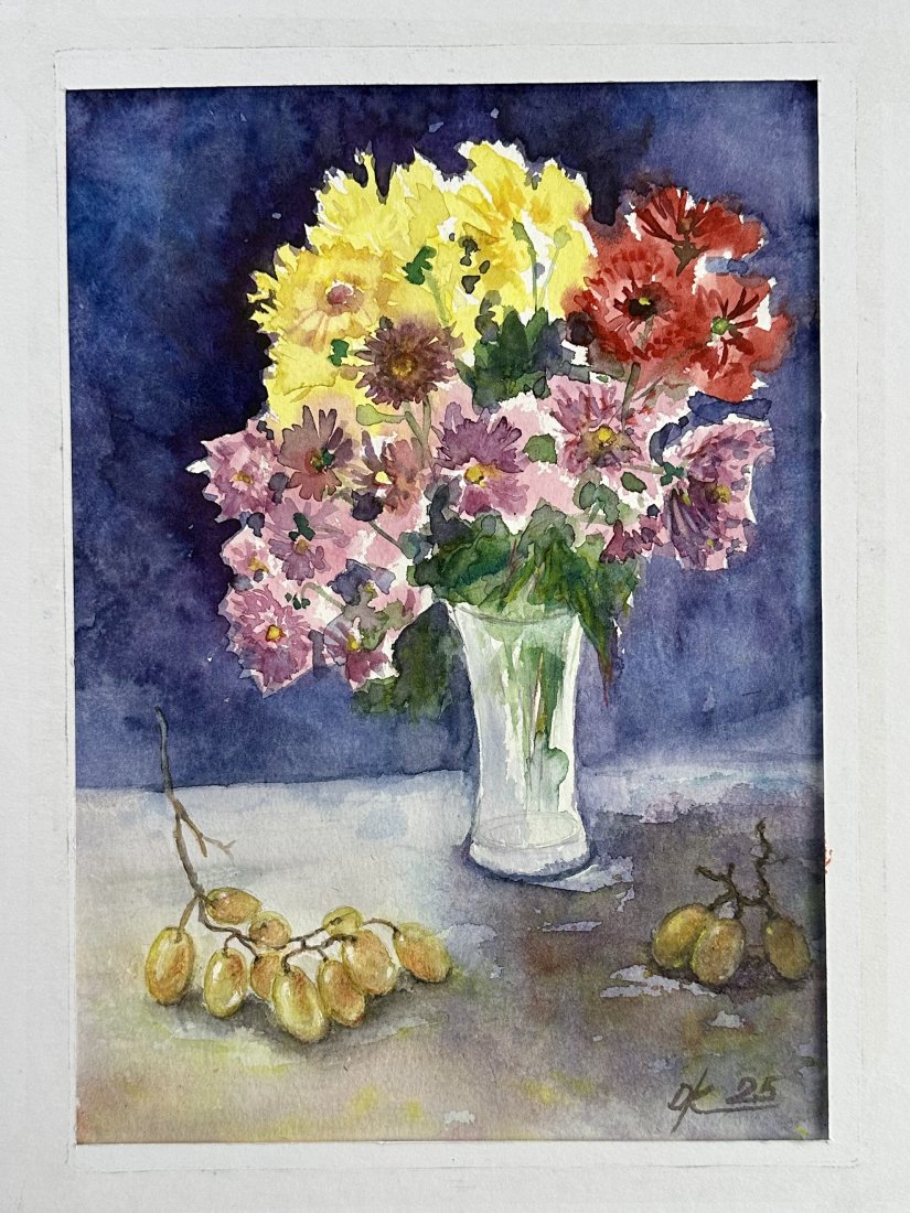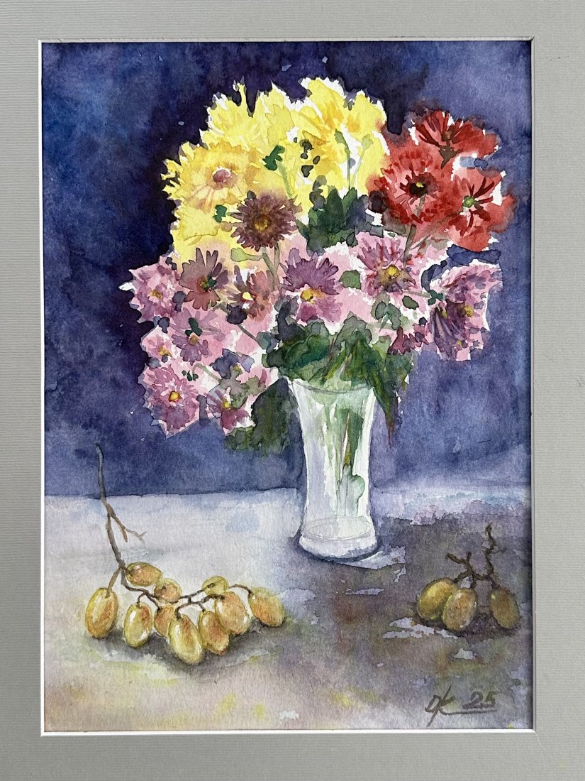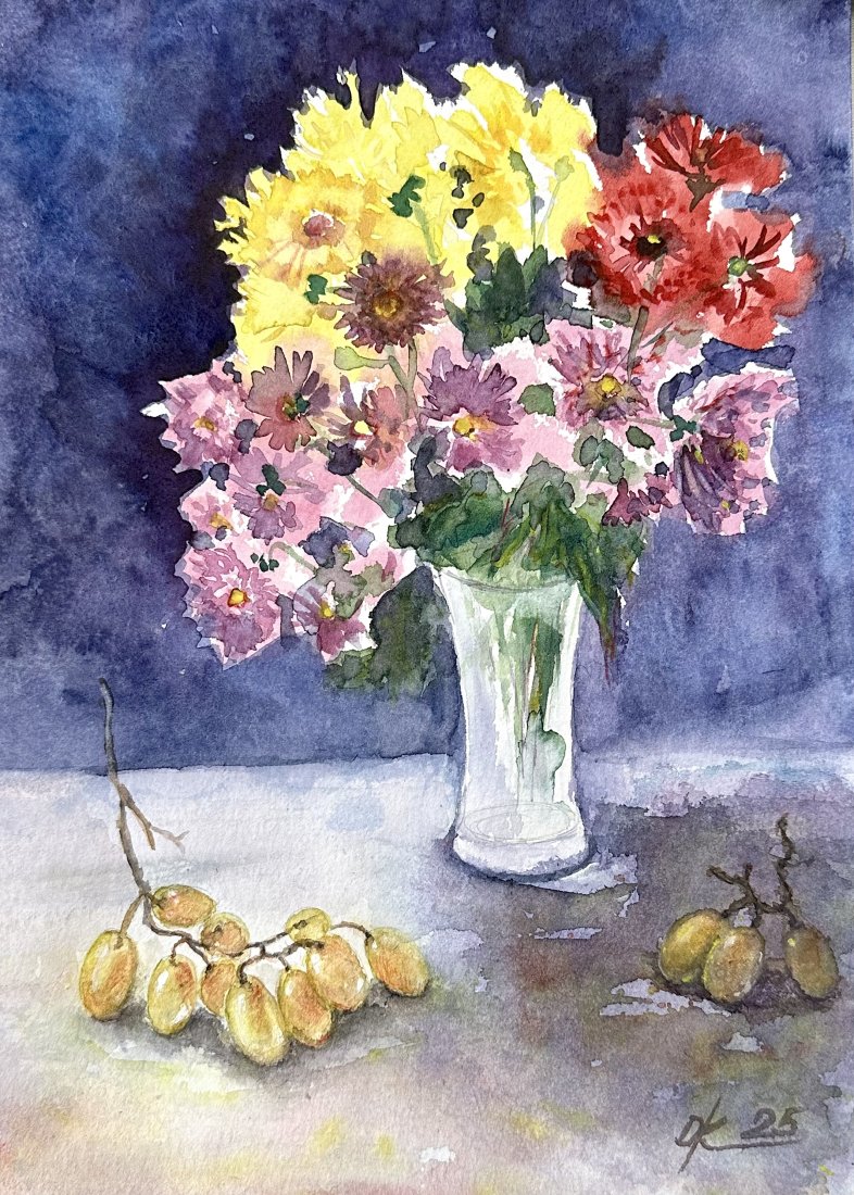 Chryzantemy i winogrona Original Akwarela A4 ręcznie malowana.