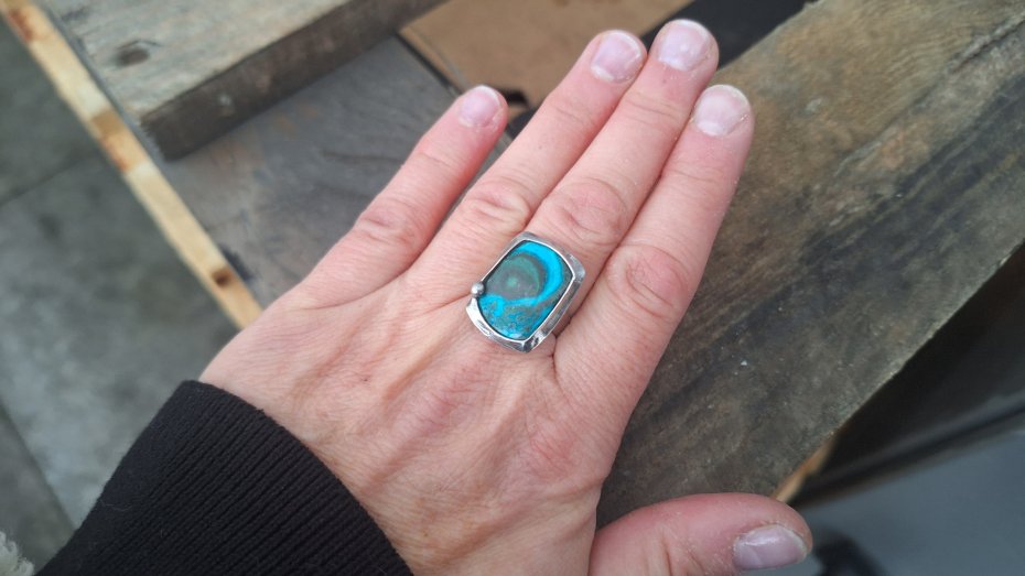 Pierścionek wykonany z miedzi, cyny i chryzokoli z azurytem. Wymiary ok. 2 na 1.6 cm. Regulowany. Nie jest ciężki.