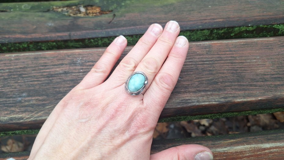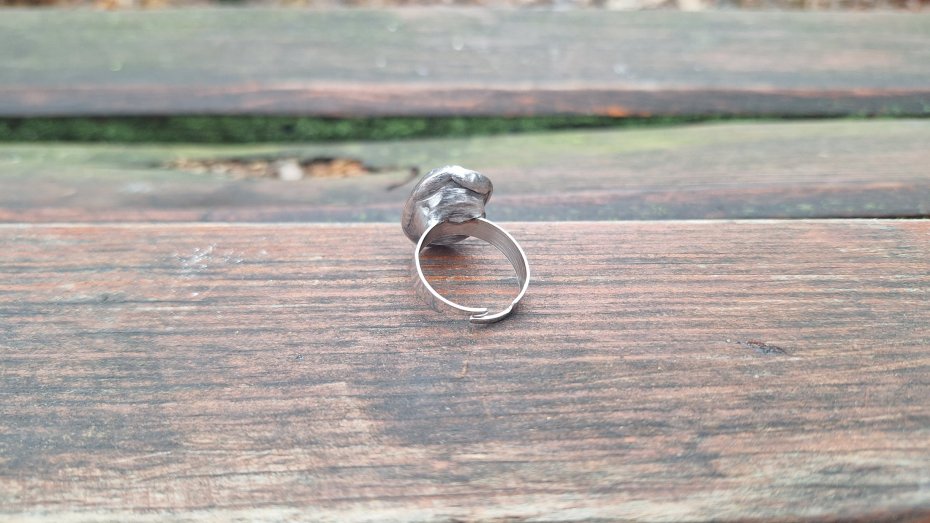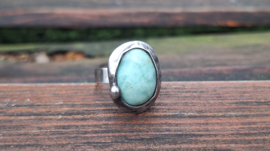 Pierścionek wykonany z miedzi, cyny i naturalnego chryzoprazu. Wymiary ok. 2 na 1.5 cm. Regulowany. Nie jest ciężki.