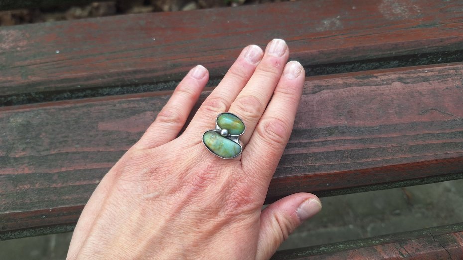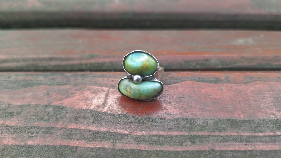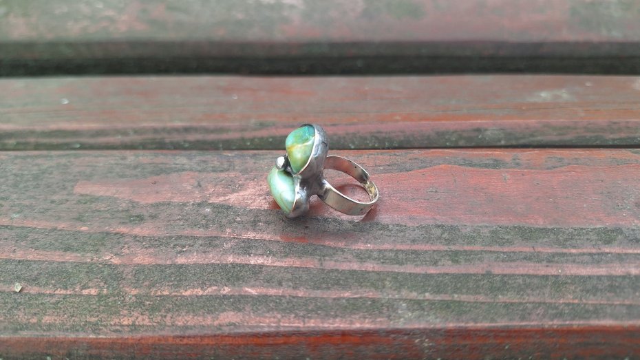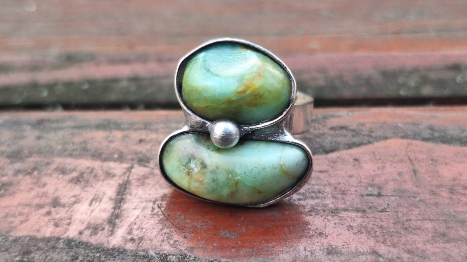 Pierścionek wykonany z miedzi, cyny i naturalnego chryzoprazu. Wymiary ok. 2 na 2 cm. Regulowany. Nie jest ciężki.