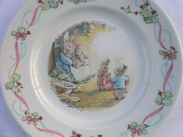Urokliwym obrazkiem od Beatrix Potter zdobiony, porcelanowy talerz okazjonalny na chrzciny, sygnowany jakością Wedgwood. Błyszczące szkliwienie, jakość wykonania. 18 x 2 cm. Stan zachowania dobry plus (sztućcowe ślady użytkowania).