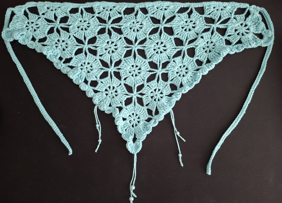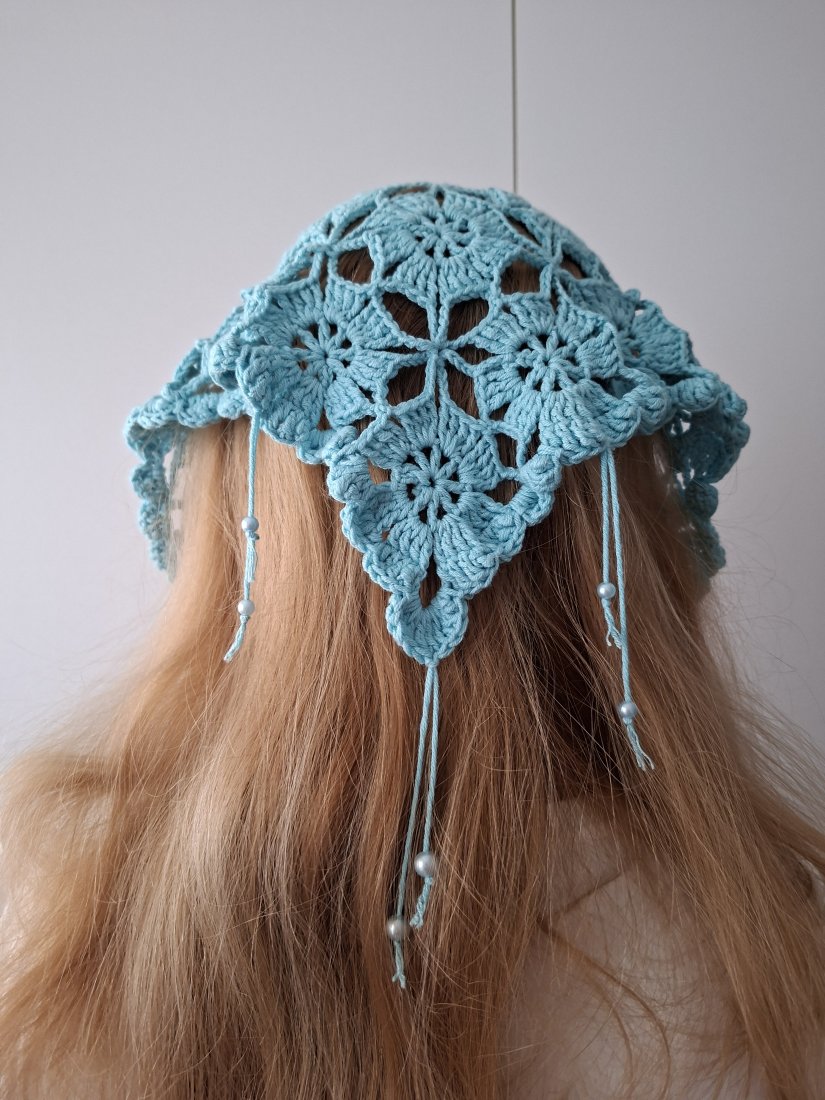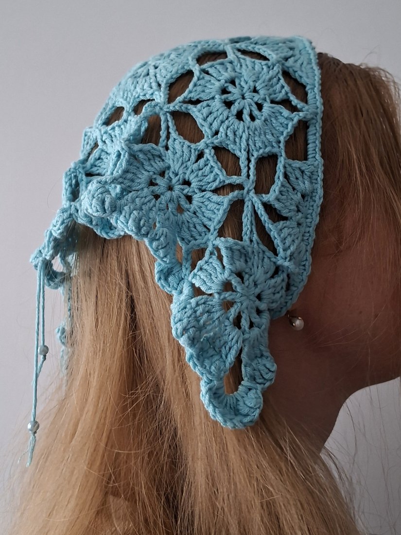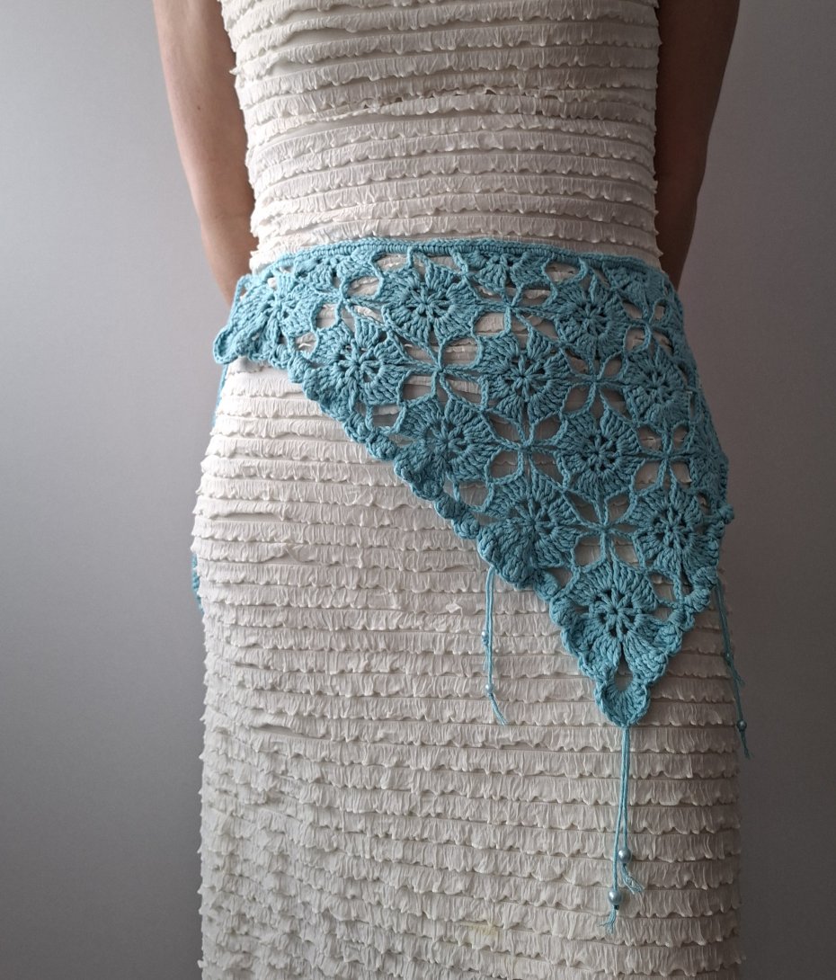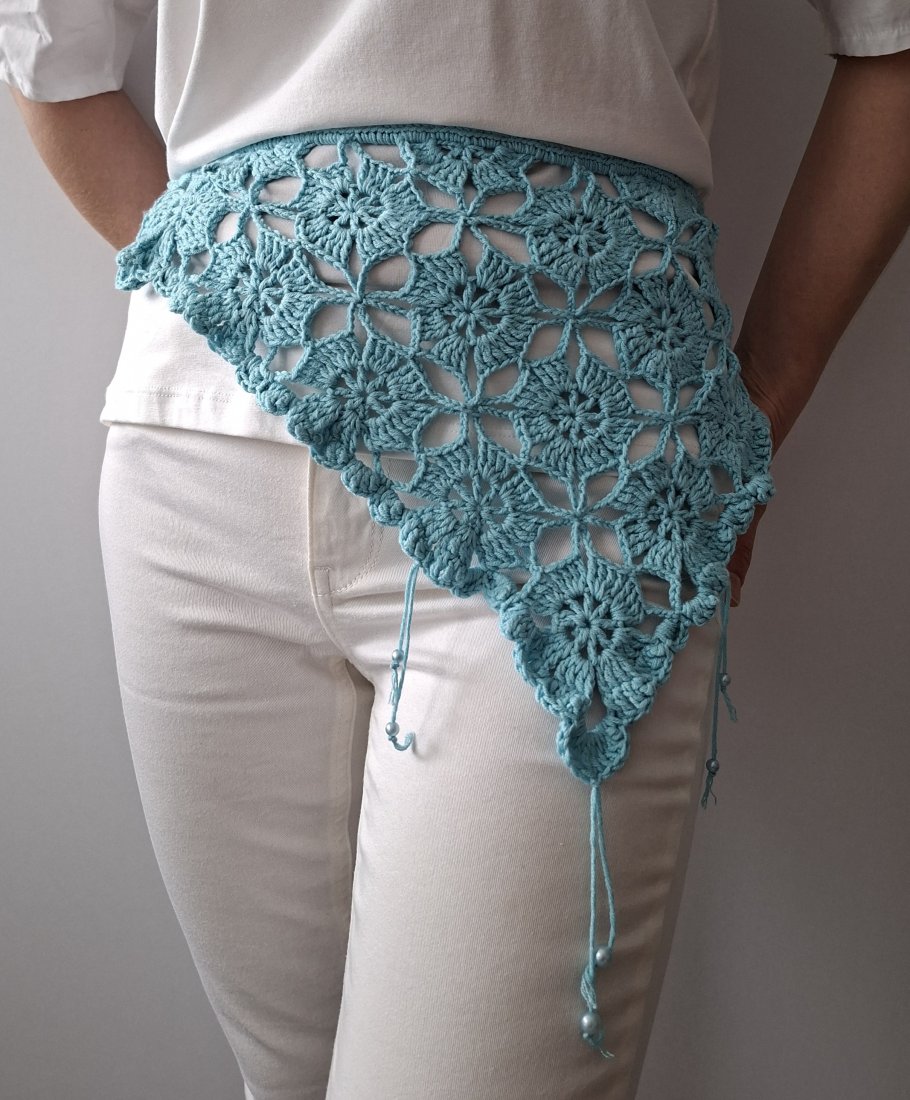 Elegancka, ręcznie wykonana chusta biodrowa z ażurowym wzorem, idealna jako stylowy dodatek do letnich stylizacji. Wykonana na szydełku z miękkiej, przyjemnej w dotyku przędzy w subtelnym, turkusowym odcieniu. Geometryczno-kwiatowy motyw nadaje jej lekkości i wyjątkowego charakteru.