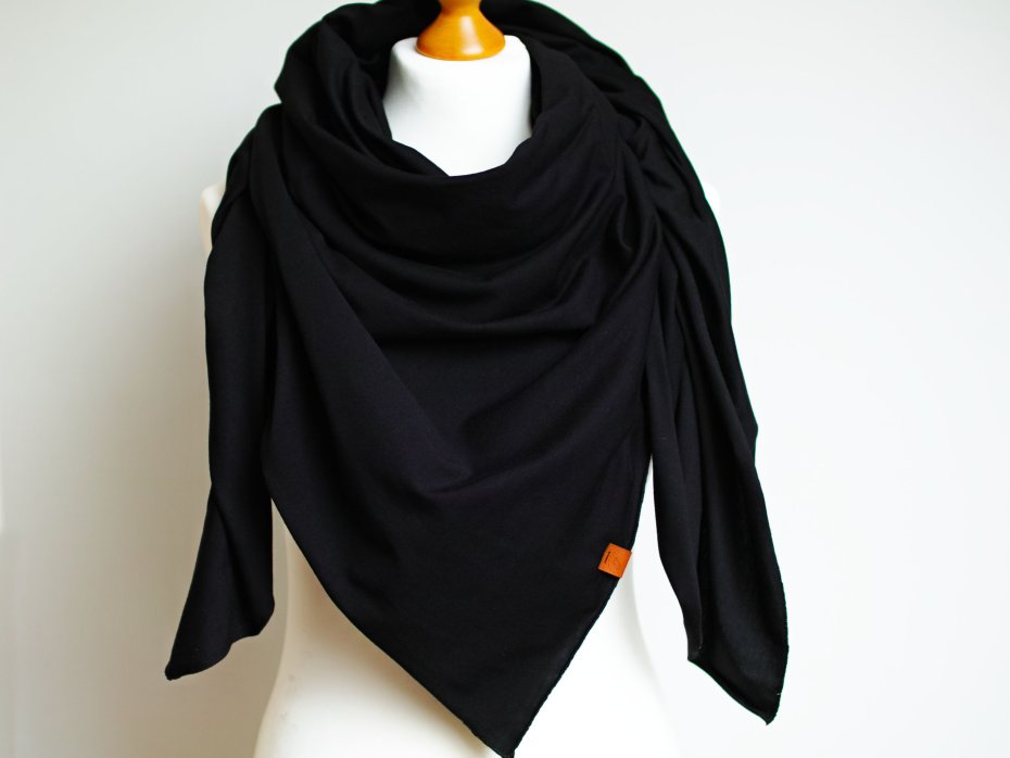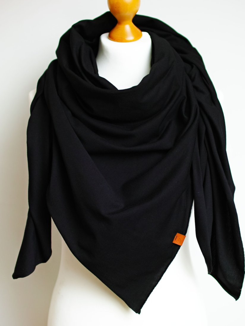 Duża chusta bawełniana na wiosnę/jesień. Uszyta z cienkiej dzianiny bawełnianej w kolorze czarnym. Tkanina to certyfikowana bawełna, przyjazna dla skóry.