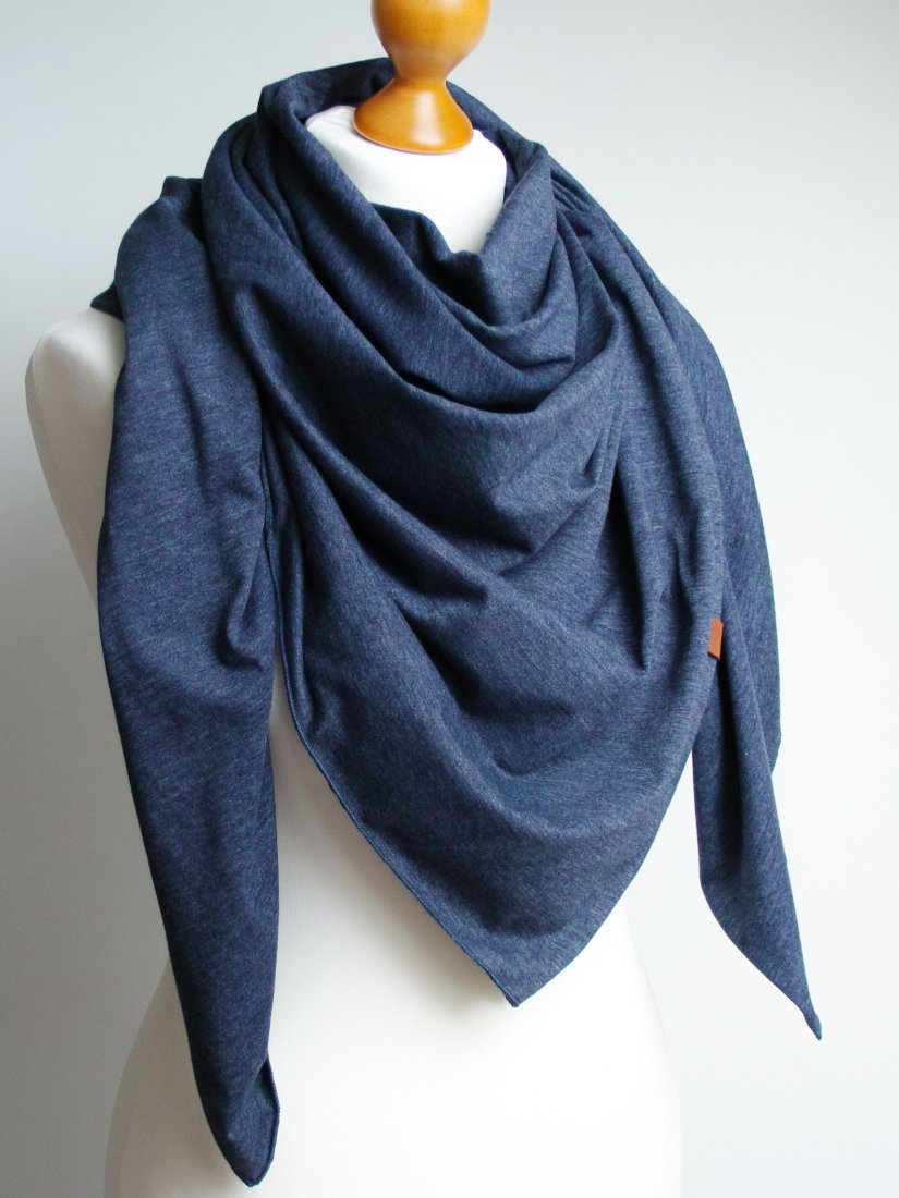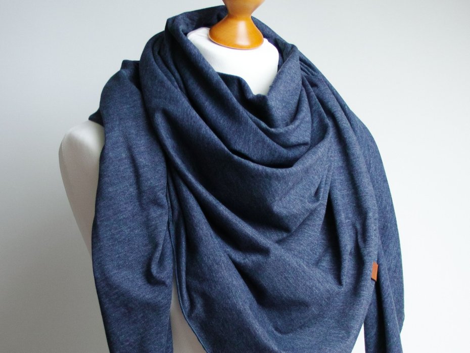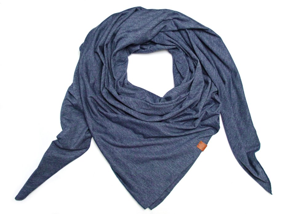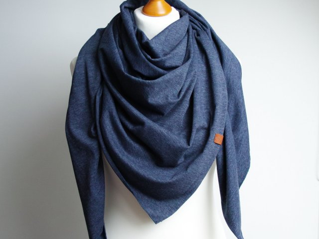 Duża chusta bawełniana na wiosnę/jesień. Uszyta z cienkiej dzianiny bawełnianej w kolorze jeansowym. Tkanina to certyfikowana bawełna, przyjazna dla skóry.