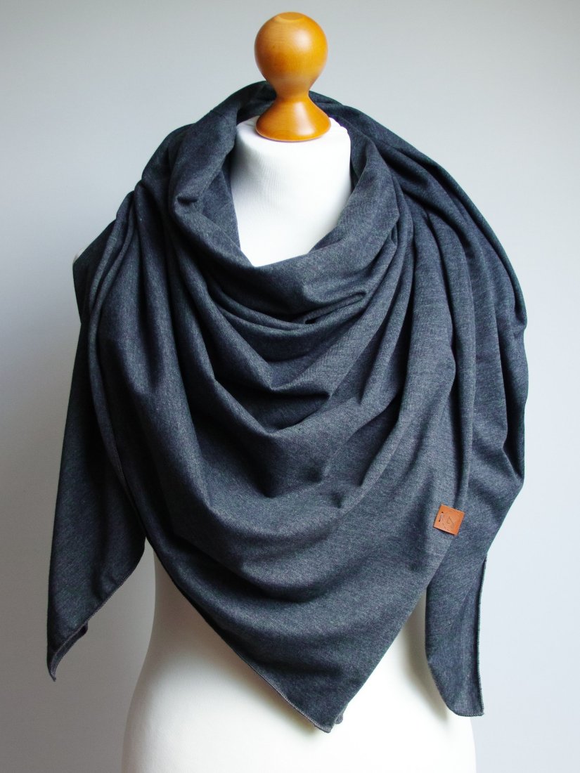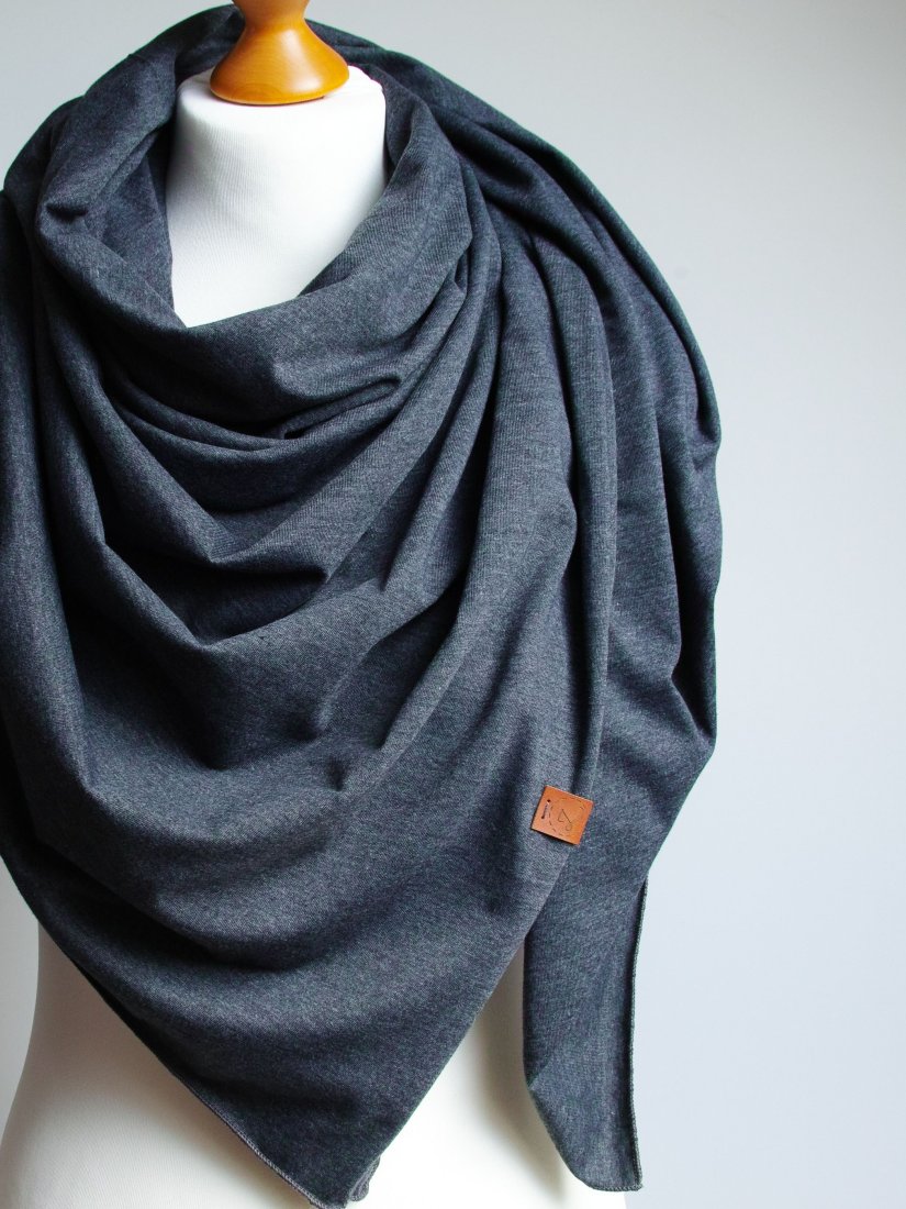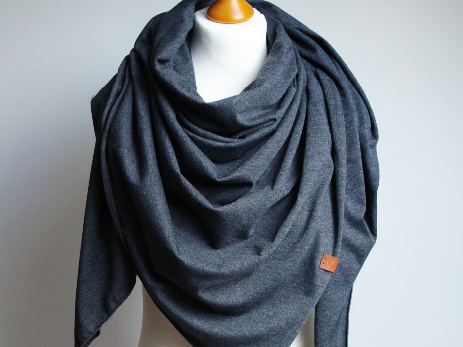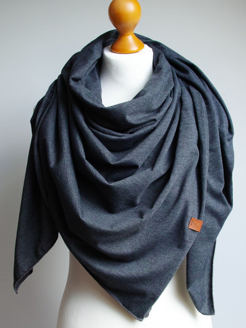 Duża chusta bawełniana na wiosnę/jesień. Uszyta z cienkiej dzianiny bawełnianej w kolorze grafitowym. Tkanina to certyfikowana bawełna, przyjazna dla skóry.