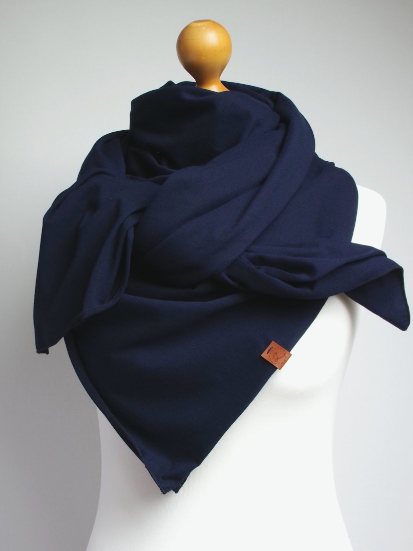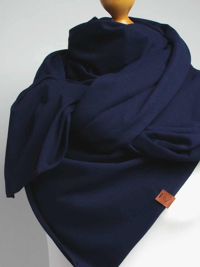Duża chusta bawełniana na wiosnę/jesień. Uszyta z cienkiej dzianiny bawełnianej w kolorze granatowym. Tkanina to certyfikowana bawełna, przyjazna dla skóry.
