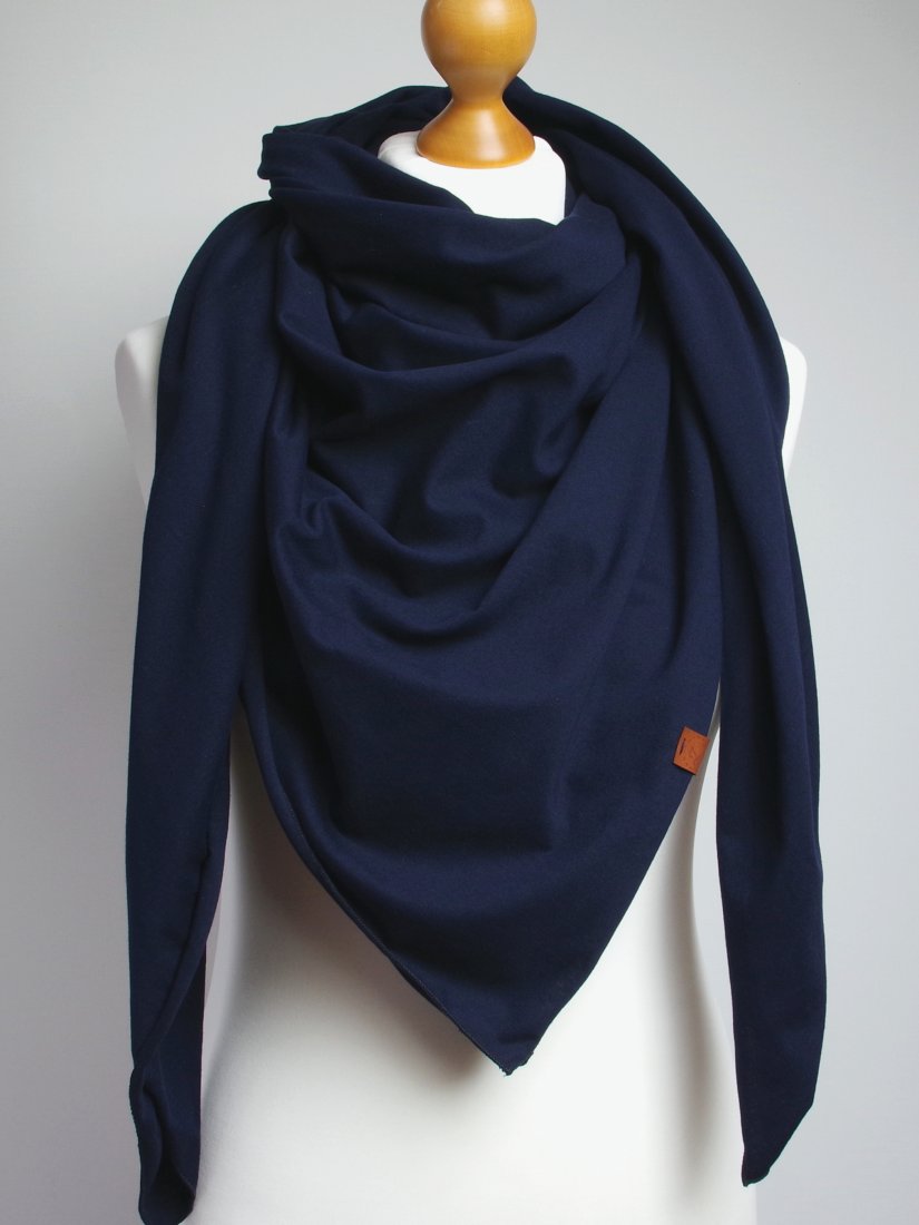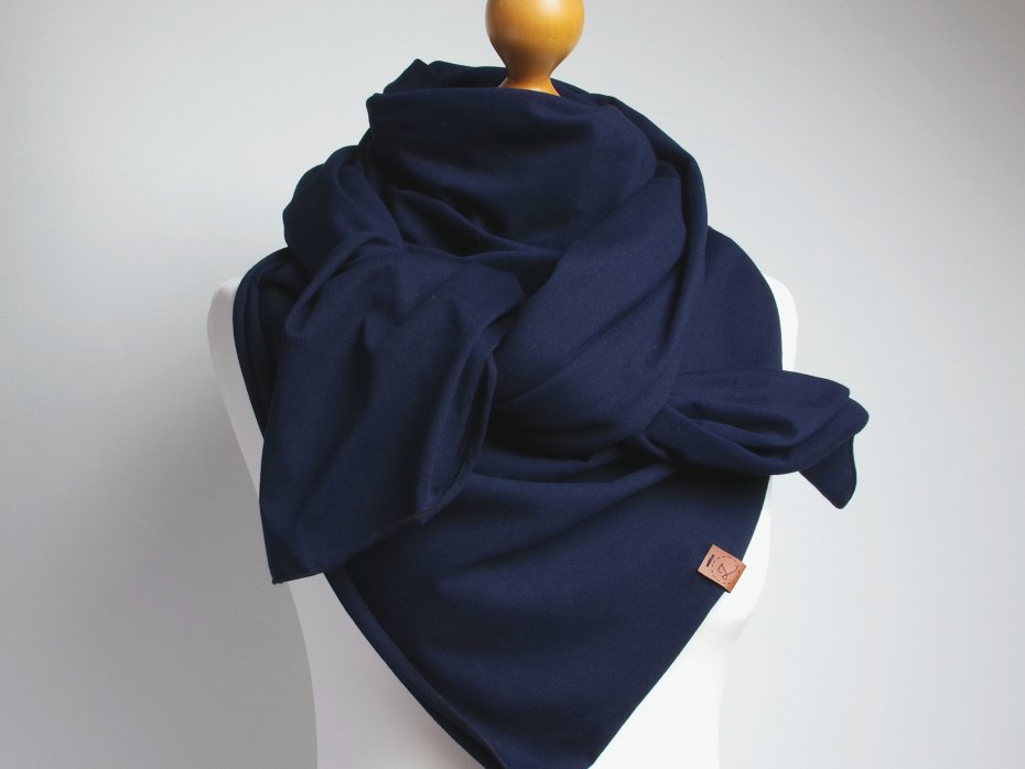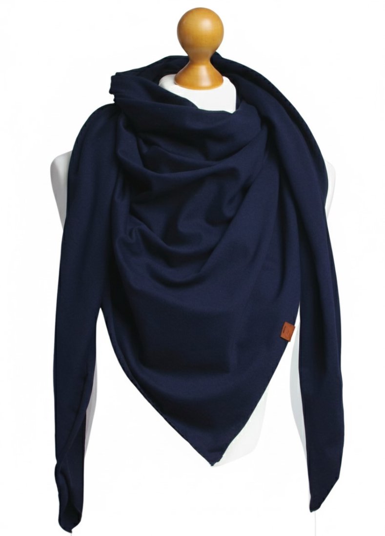 Duża chusta bawełniana na wiosnę/jesień. Uszyta z cienkiej dzianiny bawełnianej w kolorze granatowym. Tkanina to certyfikowana bawełna, przyjazna dla skóry.