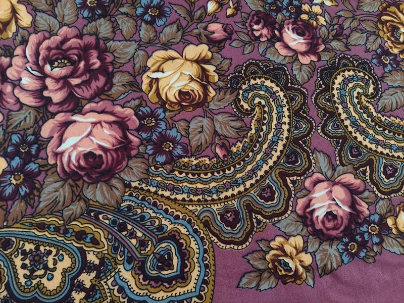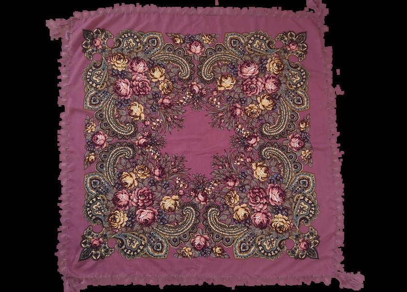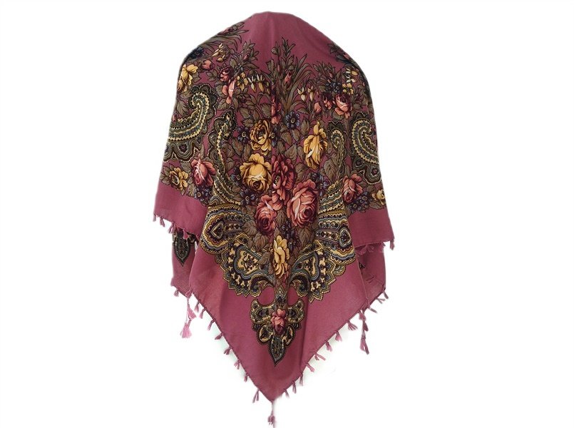 Chusta w kolorze brudnego różu, zdobiona kwiatowym wzorem folk. Wykończona krótkimi frędzlami dookoła.