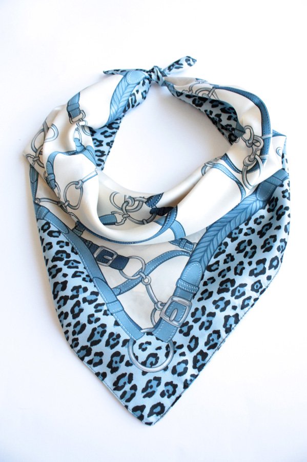 Włoska apaszka we wzory w stylu domu mody Hermes. Piękne odcienie błękitu, które nadadzą stonowanemu strojowi nowego charakteru.