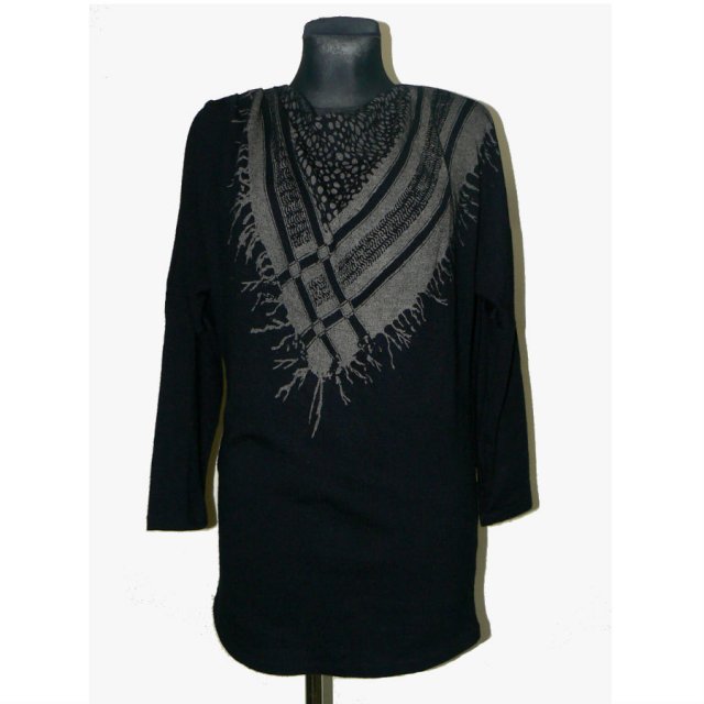 Świetna dłuższa bluza z nadrukowaną z przodu arafatką, tył gładki czarny. Dekolt lekko opadający, ala woda, ale nie jest bardzo niski. Ma szlufki na wąski pasek.