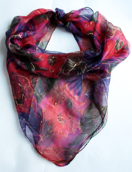 Delikatna chusta-mgiełka w kwiaty, ozdobiona farbą w kolorze starego złota.