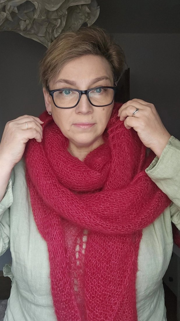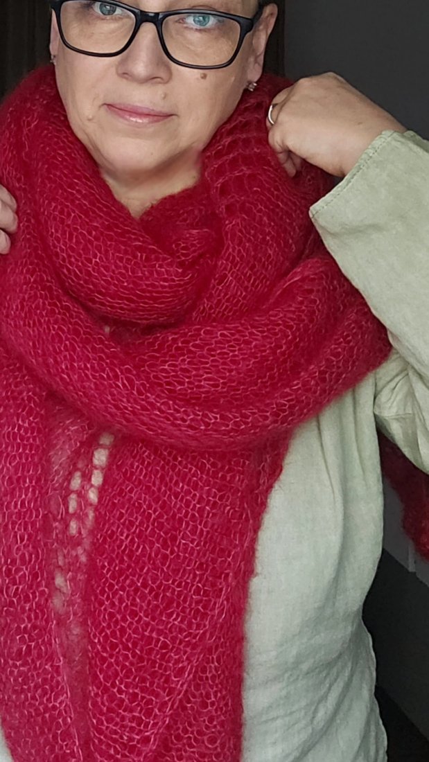 Chusta wykonana na drutach z wysokiej jakości moheru i jedwabiu, duża i lekka, idealny dodatek do różnych stylizacji oraz praktyczne okrycie ramion.