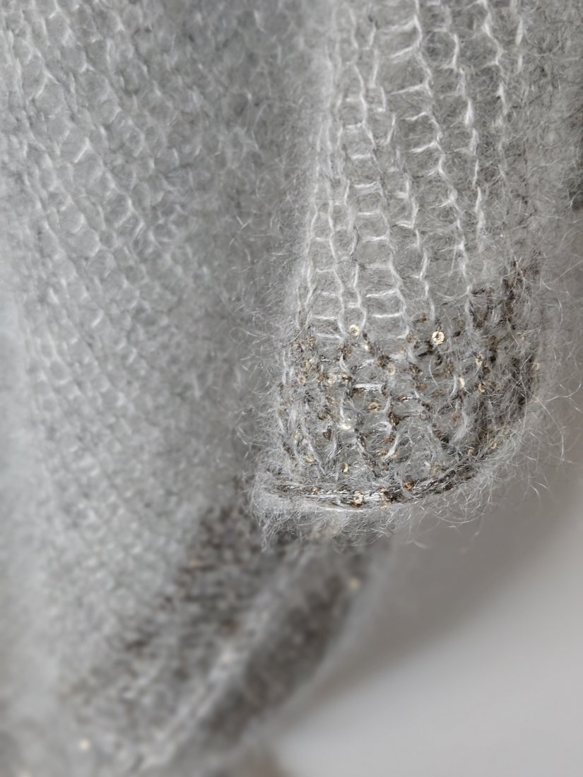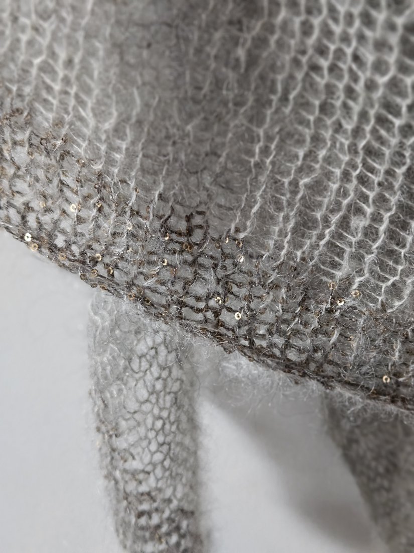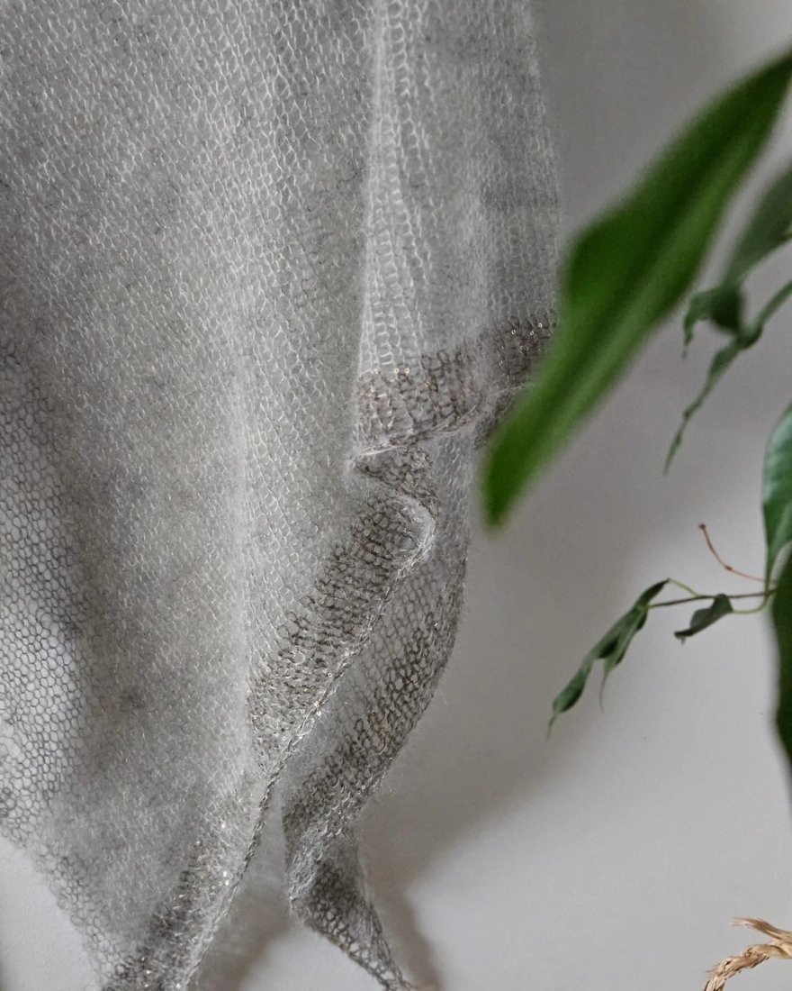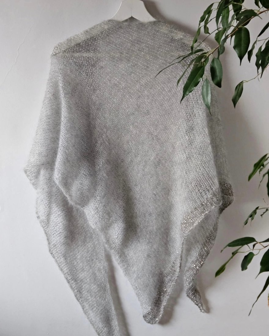 Chusta wykonana na drutach z wysokiej jakości moheru i jedwabiu, duża i lekka, idealny dodatek do różnych stylizacji oraz praktyczne okrycie ramion .