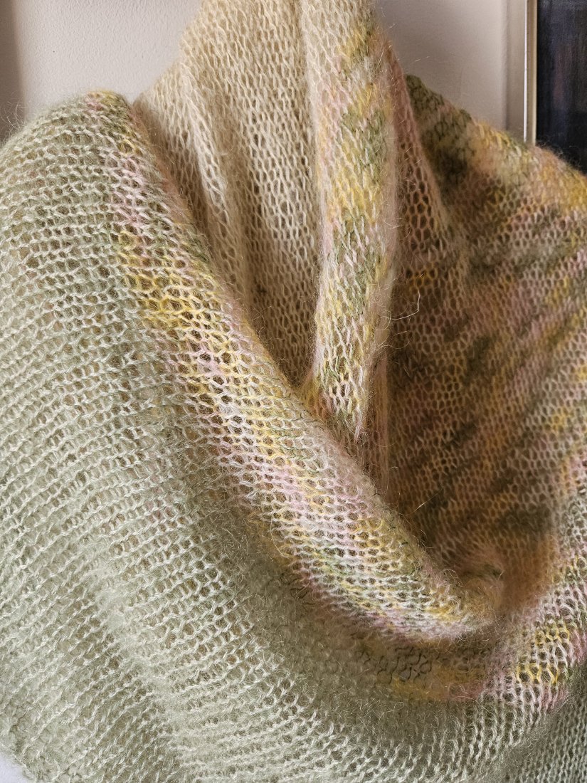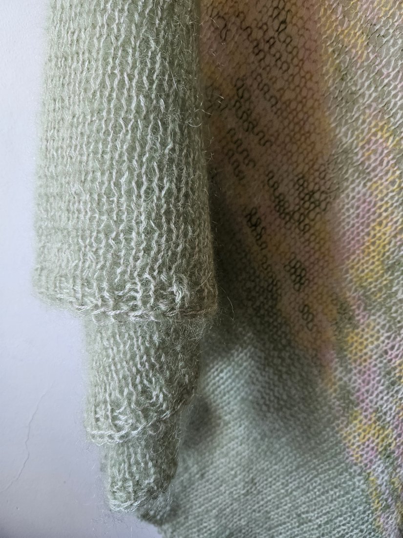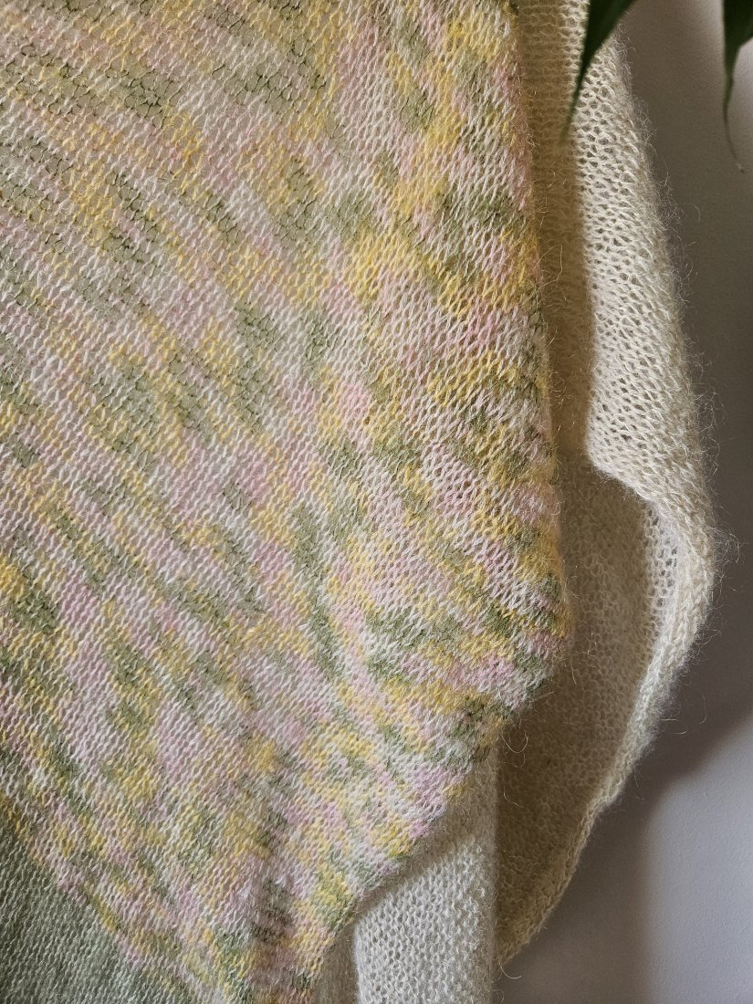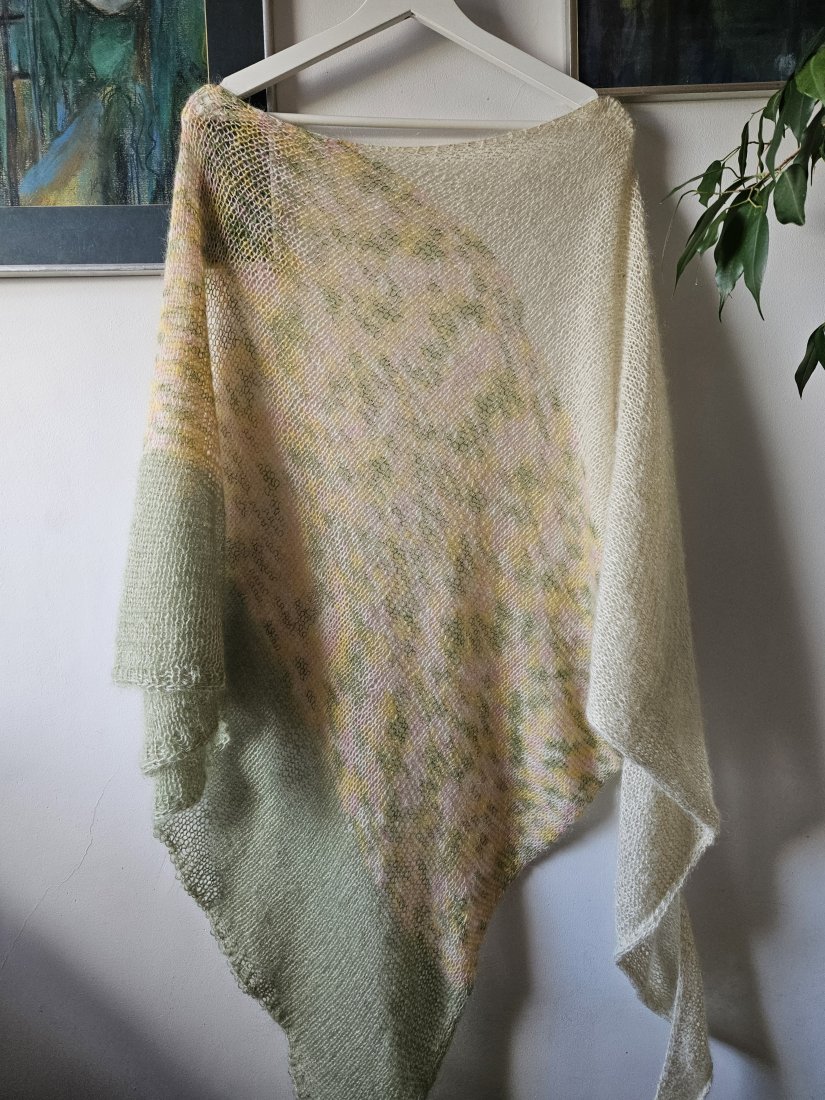 Chusta wykonana na drutach z wysokiej jakości moheru i jedwabiu, duża i lekka, idealny dodatek do różnych stylizacji oraz praktyczne okrycie ramion .