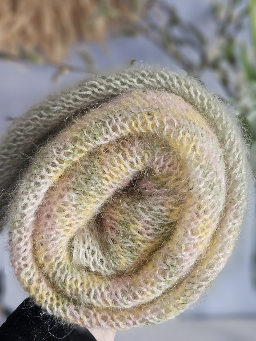 Zalecane jest pranie ręczne, aby uniknąć uszkodzenia delikatnej struktury włóczki. Aby utrzymać chustę w dobrym stanie, należy ją prać w letniej wodzie a następnie suszyć w pozycji poziomej na płaskiej powierzchni, aby uniknąć deformacji. Materiał moher i jedwab. Idealna na prezent. Najdłuższy bok to 200 cm