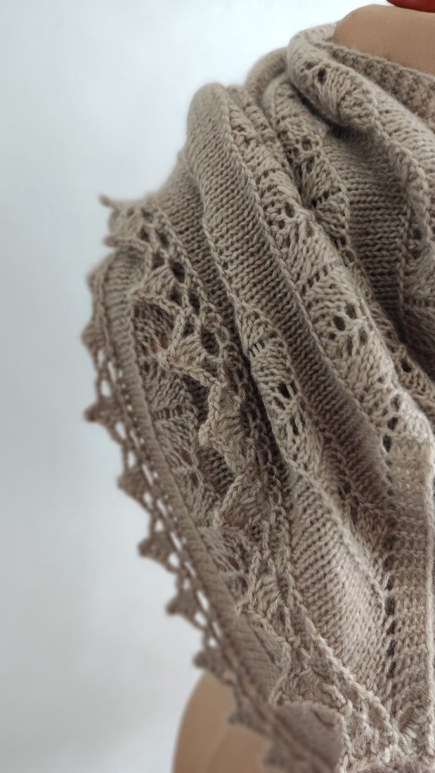 Chusta ręcznie wykonana na drutach, w kolorze beżowym.
