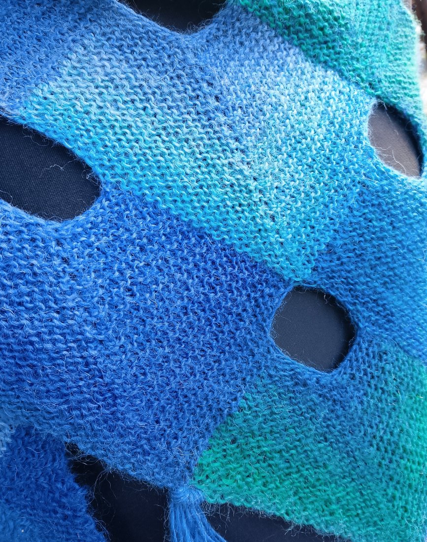 Przepiękna chusta w całości wykonana ręcznie na cienkich drutach gęstym ściegiem. Użyto ciepłej włóczki wełniano-moherowo-akrylowej w cieniowanych kolorach niebiesko turkusowo zielonych. Zastosowano niezwykle dekoracyjny wzór, dodatkowo chusta zakończona jest ozdobnymi frędzlami. Może stać się wyjątkowym prezentem dla wyjątkowej osoby.