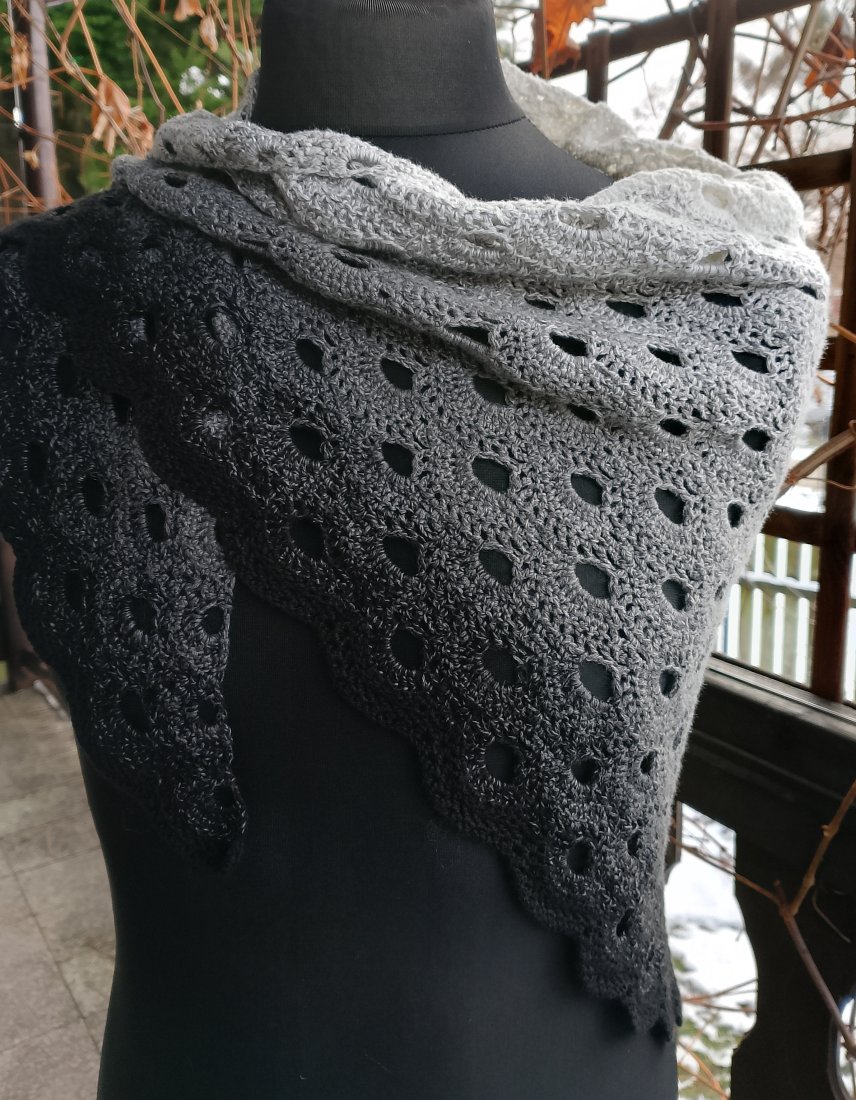 Chusta szydełkowa wykonana ręcznie pięknym wzorem z włóczki odpornej na mechacenie (akryl 50% bawełna 50%), bardzo przyjemnej w dotyku (nie gryzie). Uroku dodają jej ładne przejścia kolorystyczne od kremowej bieli poprzez jasno szary, szary, do czarnego, tworząc efekt ombre.