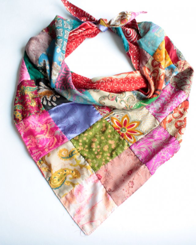 Wyjątkowa, patchworkowa chusta o trójkątnym kształcie. Z drugiej strony jednolity materiał.