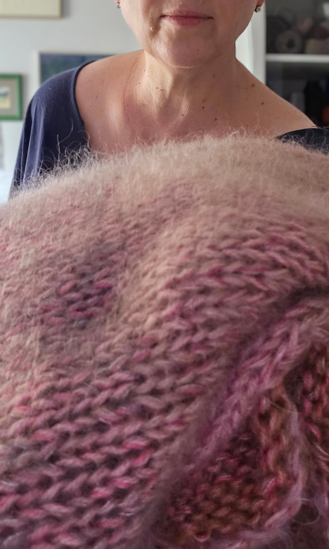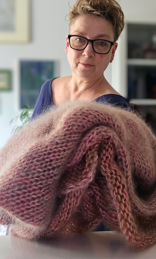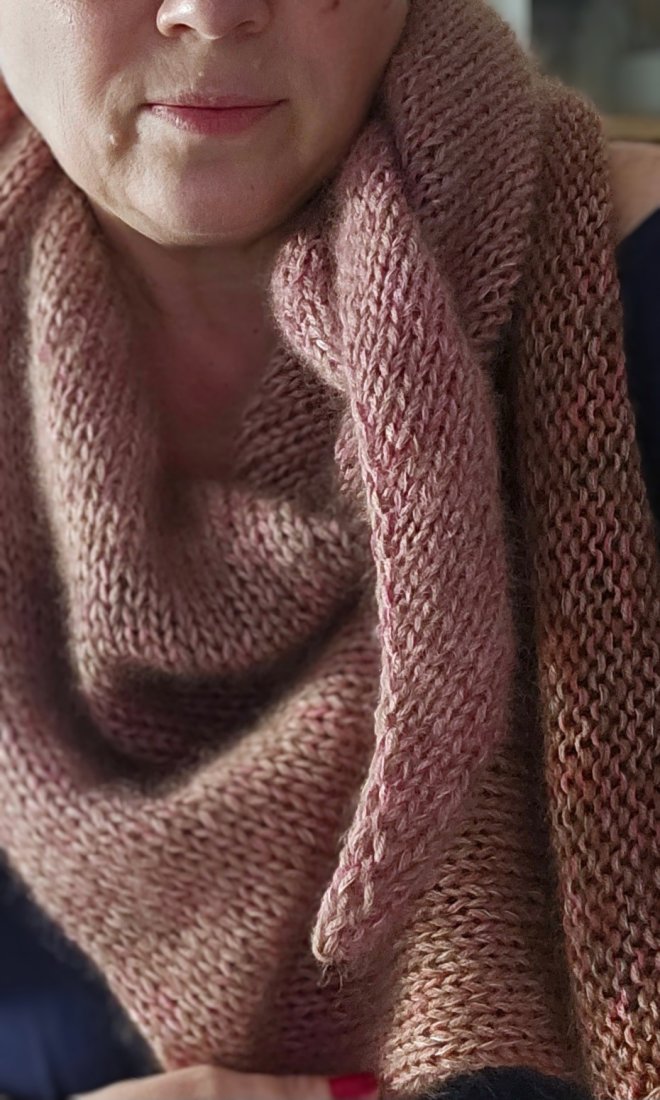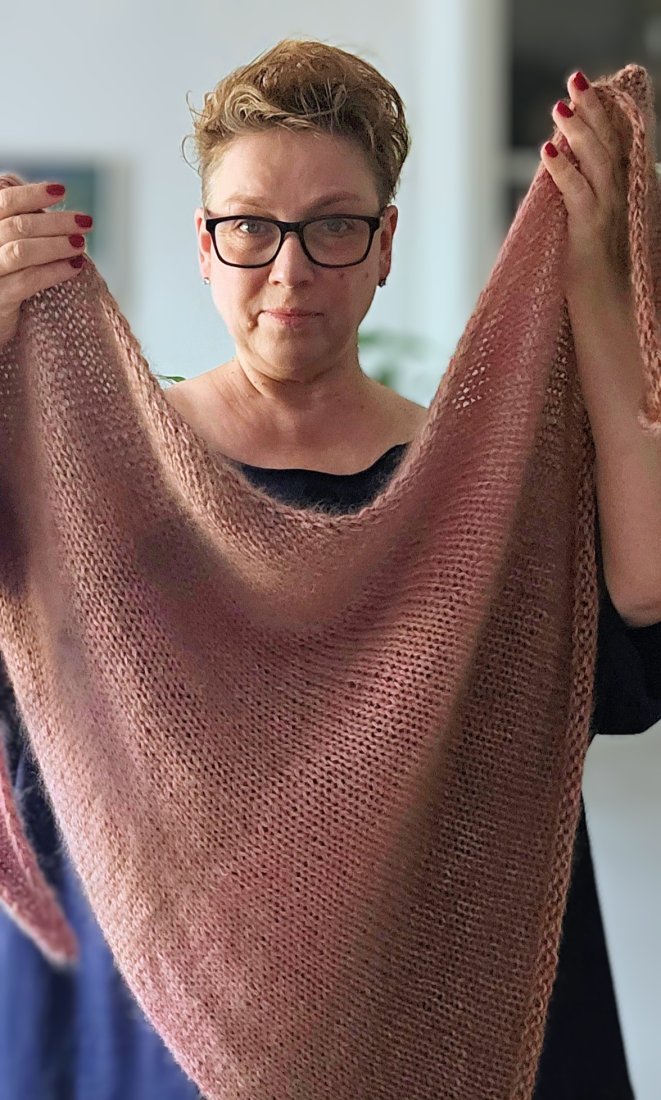 Ta chusta została wykonana ręcznie na drutach z wysokiej jakości przędzy: miękkiego merynosa oraz dwóch nitek delikatnego moheru z jedwabiem. Połączenie tych włókien sprawia, że chusta jest wyjątkowo lekka, puszysta i przyjemna dla skóry – otula, nie gryzie i nie drażni.