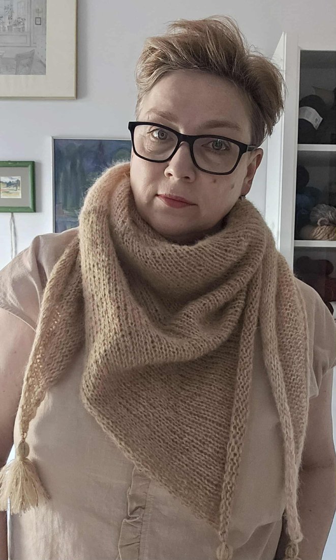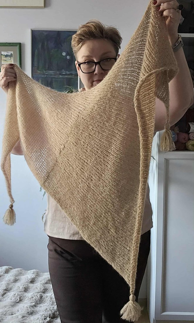 Ta chusta została wykonana ręcznie na drutach z wysokiej jakości przędzy: miękkiego merynosa oraz alpaki i nitki delikatnego moheru z jedwabiem. Połączenie tych włókien sprawia, że chusta jest wyjątkowo lekka, puszysta i przyjemna dla skóry . Ozdobne chwosty z dodatkiem paillettes (cekiny)