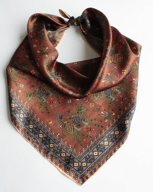 Chusta we wzory w stylu retro, o ręcznie rolowanych brzegach. Materiał z jednej strony posiada bardzo subtelny połysk.
